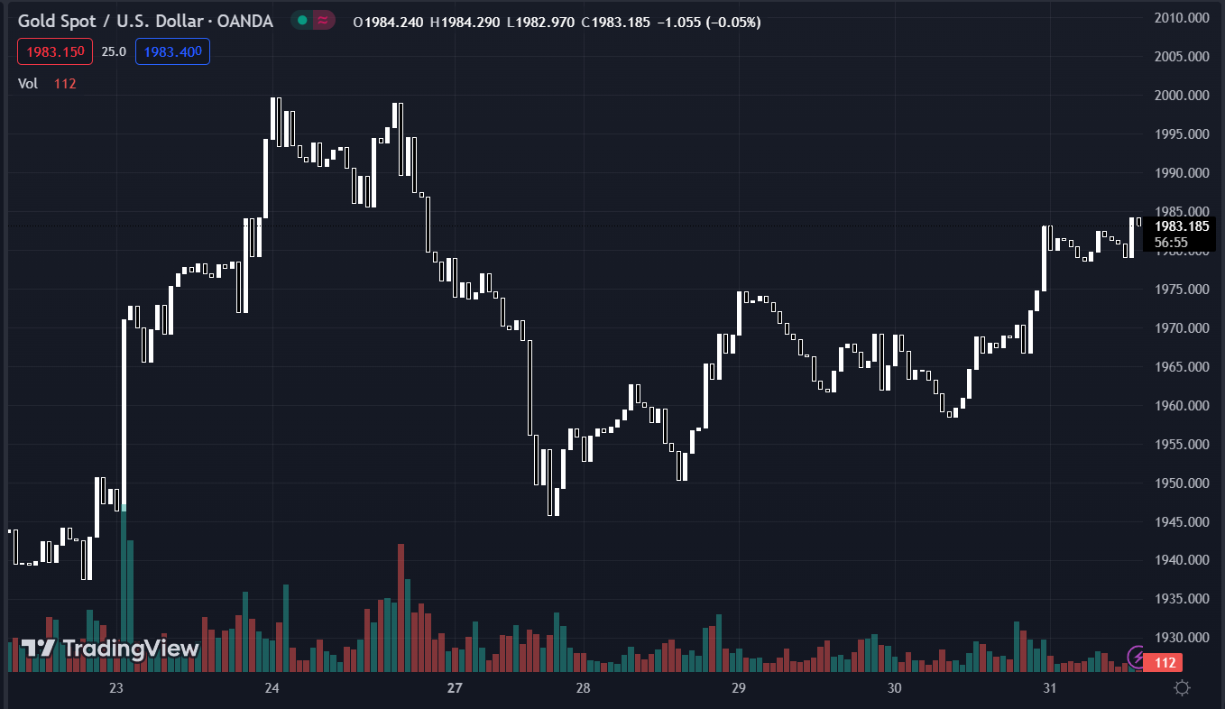 Vàng tăng $17.39/oz lên $1980.36 trong bối cảnh lợi suất TPCP các kỳ hạn tiếp tục biến động trái chiều trong phiên giao dịch hôm qua. Lợi suất TP phản ứng tiêu cực với các dữ liệu lạm phát của Tây Ban Nha và một số bang ở Đức, nhưng sau đó đã quay đầu tăng trở lại dù vẫn kết phiên trái phiếu giữa các kỳ hạn. Lợi suất 2 năm tăng 2.1bp lên 4.124% trong khi lợi suất 10 năm giảm nhẹ 1.5bp xuống còn 3.553%. Dầu WTI tăng $1.40 lên $74.37/thùng.