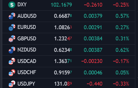 Đồng đô la cũng đang giảm nhẹ so với đồng euro và bảng Anh, với tỷ giá EUR/USD tăng trên 1.0800 và GBP/USD tăng trên 1.2300 trong ngày. Bên cạnh đó, đồng bạc xanh cũng đang gặp khó khăn với AUD/USD khi tỷ giá tăng 0.6% lên 0.6690 và NZD/USD cũng tăng 0.6% lên 0.6230 vào thời điểm hiện tại.