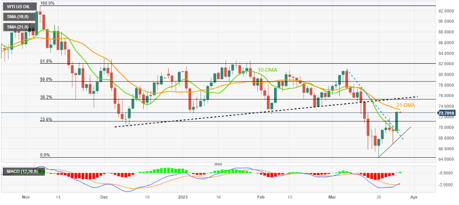 Các tín hiệu MACD tăng và giao dịch bền vững ngoài đường xu hướng tăng tuần qua cũng đã cho phép phe mua dầu thô WTI vượt qua rào cản 21-DMA xung quanh mức $73.40.