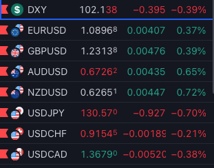 Trên thị trường FX, USD và lợi suất TPCP đồng loạt giảm mạnh. Đồng bạc xanh có lúc chạm đáy 102.065, mức thấp nhất kể từ 6/2 đến nay và yếu hơn so với hầu hết các loại tiền tệ chính, ngoại trừ CAD. EUR và JPY là hai đồng đồng tiền hưởng lợi nhiều nhất từ việc USD trượt giá do mối quan hệ tương quan nghịch đảo sâu sắc. GBP tăng một phần nhờ chỉ số CPI của Anh nóng bất thường (10.4% so với 9.8%) và đang tiếp tục chờ đợi quyết định chính sách của BOE vào tối nay.