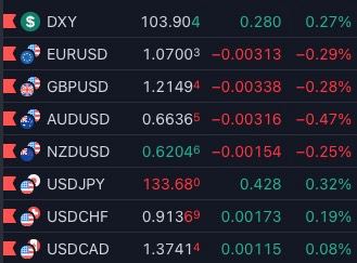 DXY rơi vào đà giảm, hiện ở ngưỡng 103.656. Trên thị trường tiền tệ, cặp GBP/USD ghi nhận mức tăng hơn 132 pips. Ở chiều ngượng lại, USD/CAD cũng giảm tới hơn 130 pips.