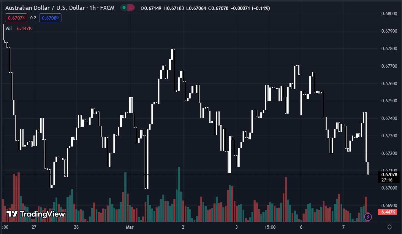 AUD/USD giảm xuống mức thấp nhất trong hai tháng vào khoảng 0.6670-80, giảm 0.9% trong ngày.