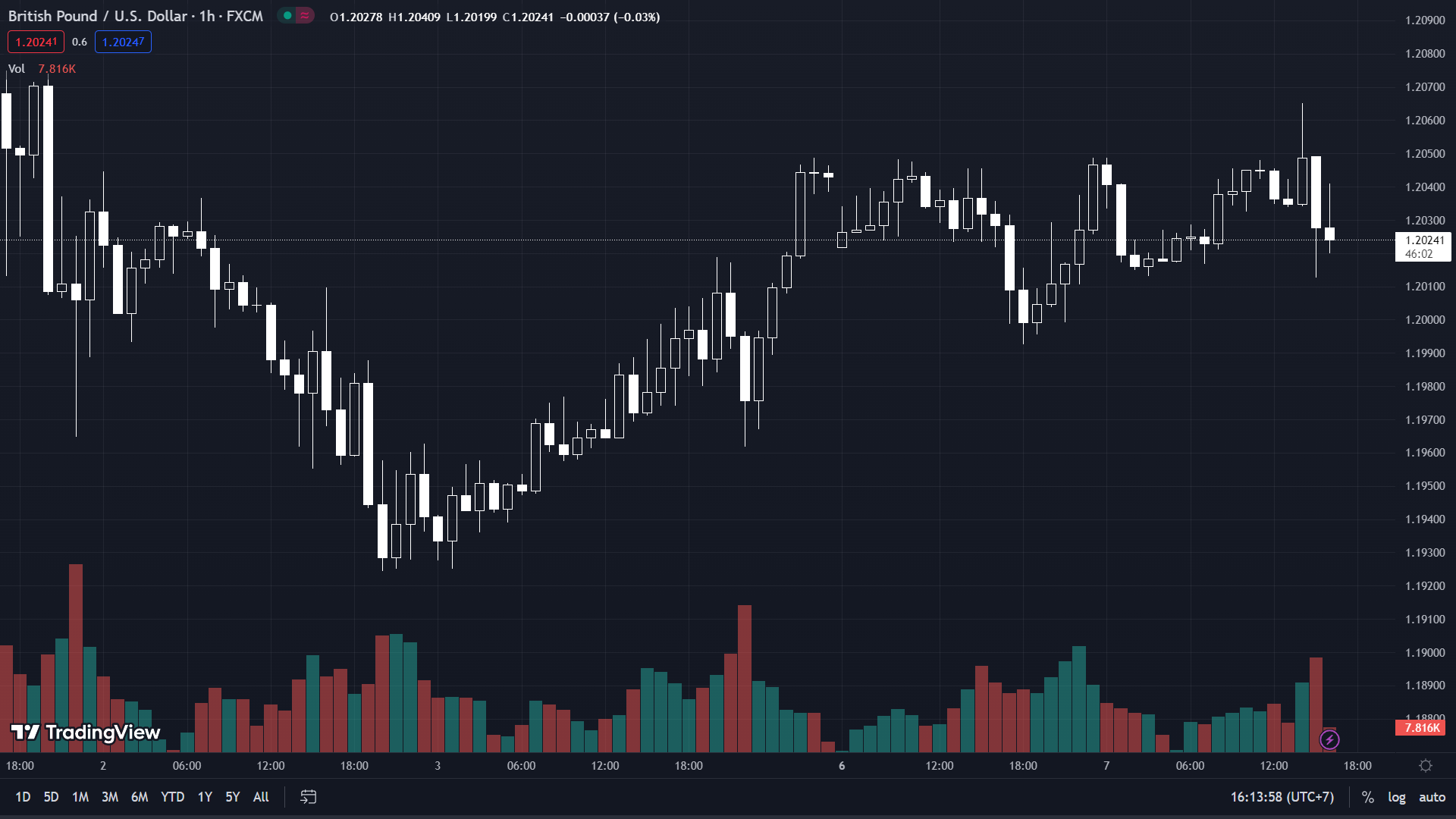 GBP/USD thoái lui đà tăng trước phiên điều trần của Powell và hiện ở mức 1.20241.
