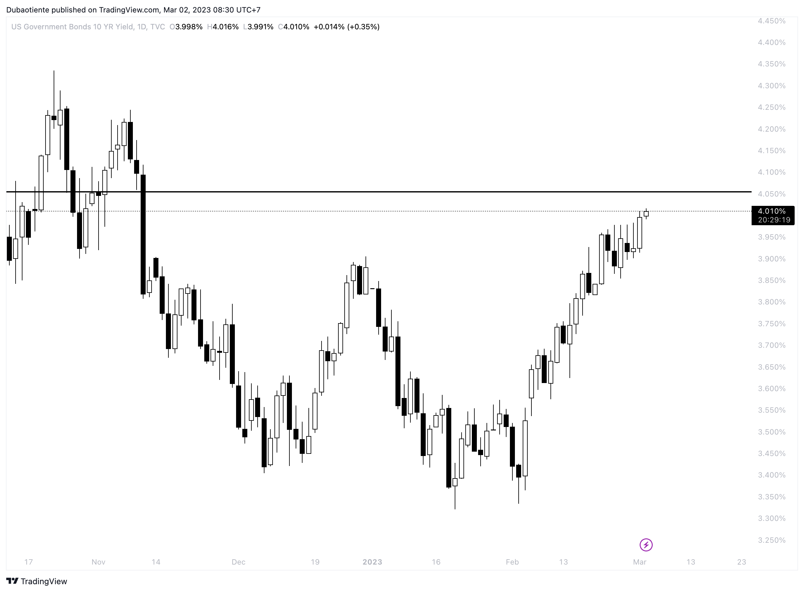 Sau phiên hôm qua tăng nóng do chỉ số giá đã trả trong báo cáo ISM vượt xa kỳ vọng, lợi suất tiếp tục tăng ngay từ đầu phiên thứ Năm. Lợi suất 2 năm đã vượt 4.9%, còn lợi suất 10 năm duy trì trên 4%.