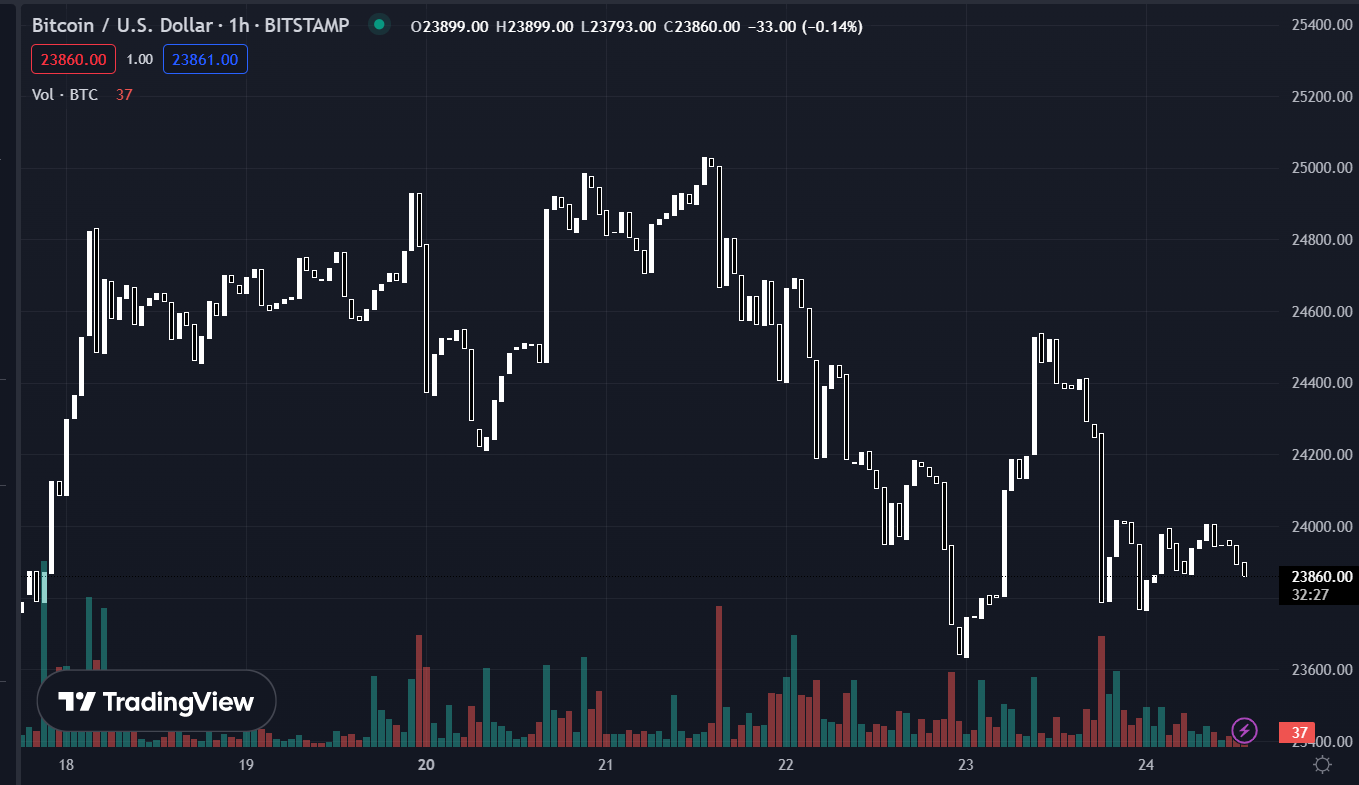 BTCUSD hiện hồi phục nhẹ lên $23,860 sau khi giảm xuống mốc $23,671 đầu phiên Á