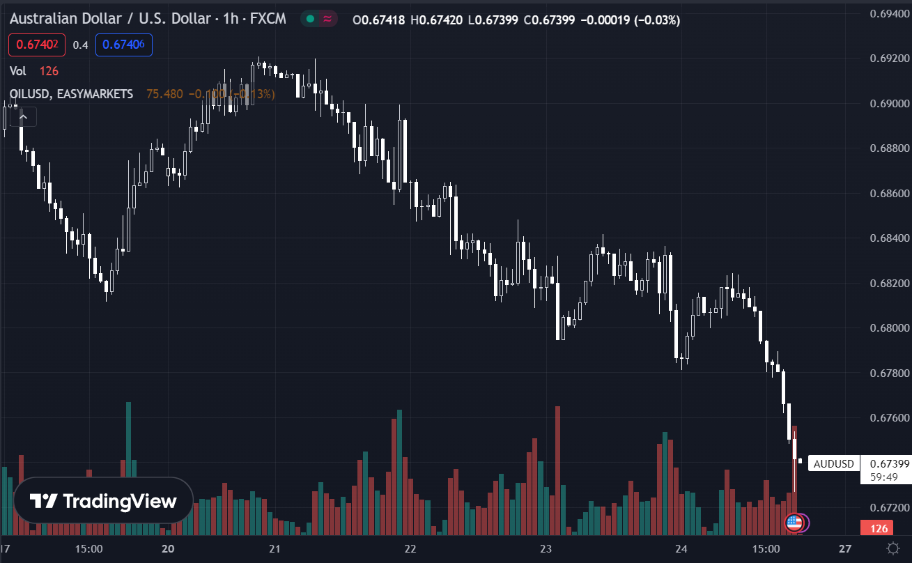 AUD/USD giảm hơn 66 pips sau báo cáo PCE cao vượt dự kiến, hiện ở mức 0.67399.