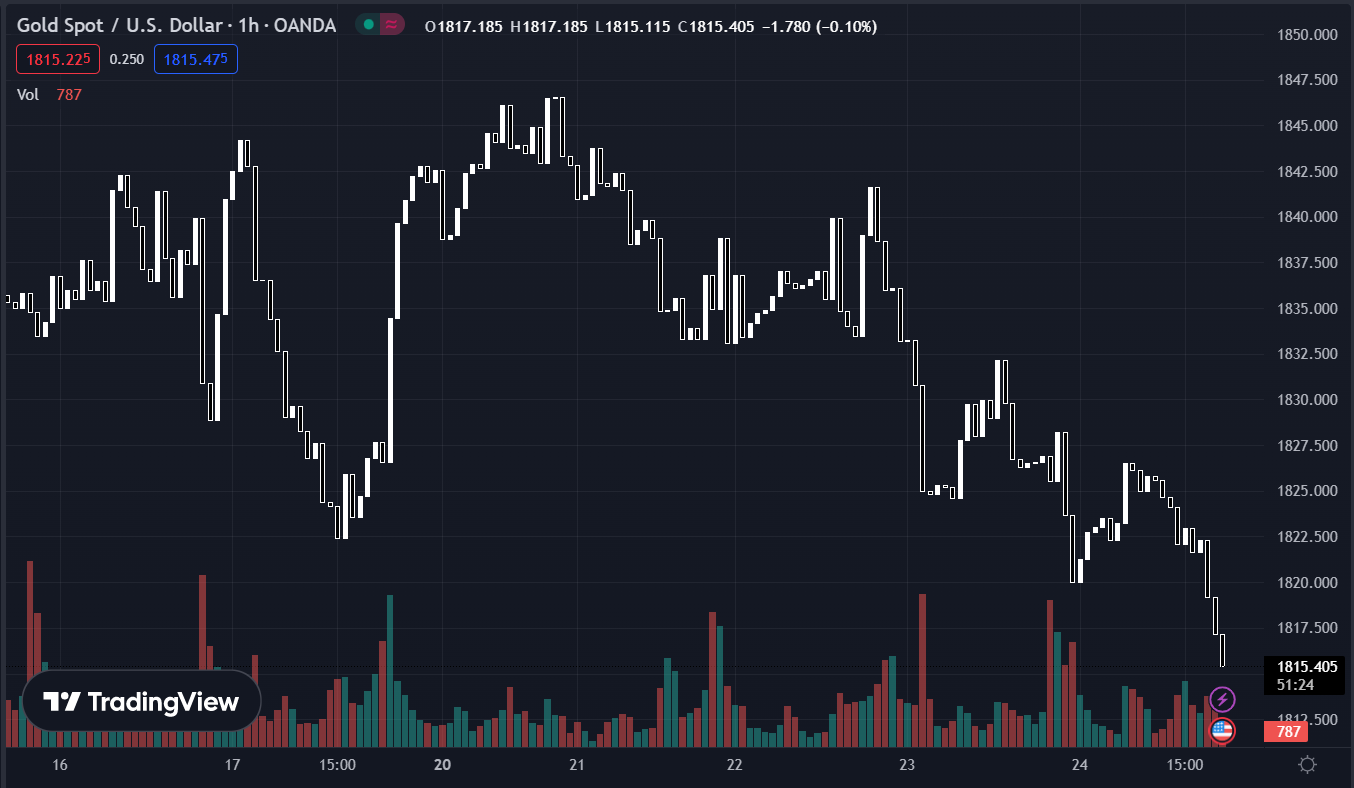 Vàng chạm đáy quanh mức $1,810, hiện tại đã hồi phục nhẹ lên 1,815.