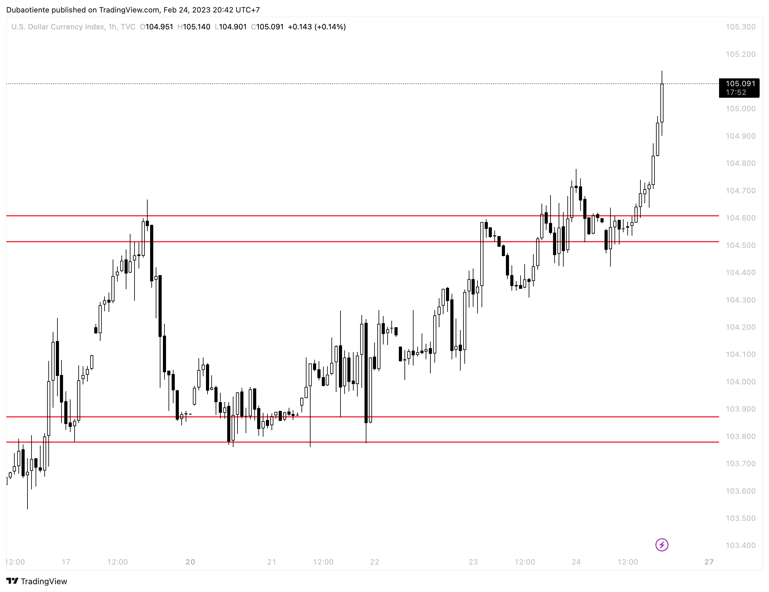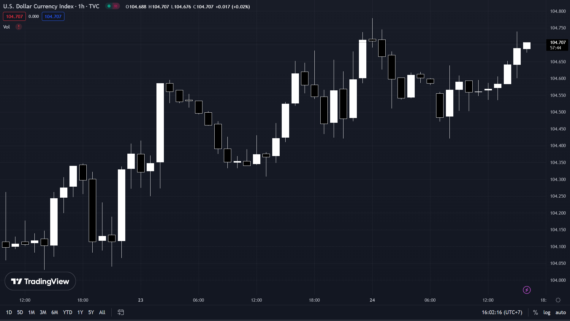 Báo cáo PCE tiếp tục ghi nhận lạm phát tăng nóng và USD đang tiếp tục tăng mạnh trong phiên, chỉ số DXY chạm mức 104.4.