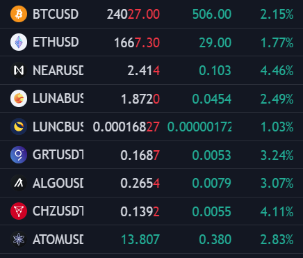 Các đồng tiền điện tử lớn hầu hết đều được bao phủ trong sắc xanh. BTC tăng 2.15%, hiện ở ngưỡng 24,027 USD.