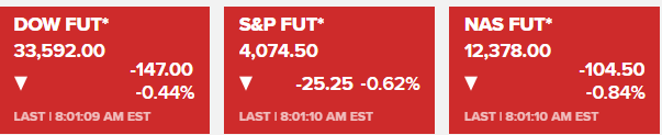 Hợp đồng tương lai chứng khoán Mỹ đồng loạt chìm tronng sắc đỏ trước giờ mở cửa phiên giao dịch ngày thứ sáu. Tâm lý nhà đầu tư có vẻ như đã trở nên dè chừng hơn sau một loạt các bình luận hawkish từ quan chức FED và dữ liệu PPI được côn bố ngày hôm qua. Hợp đồng tương lai Dow Jones giảm  mạnh nhất với 147 điểm