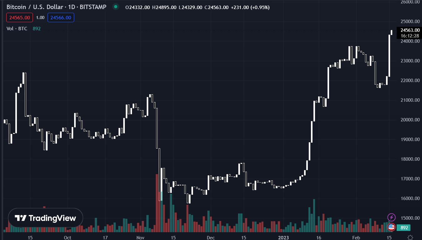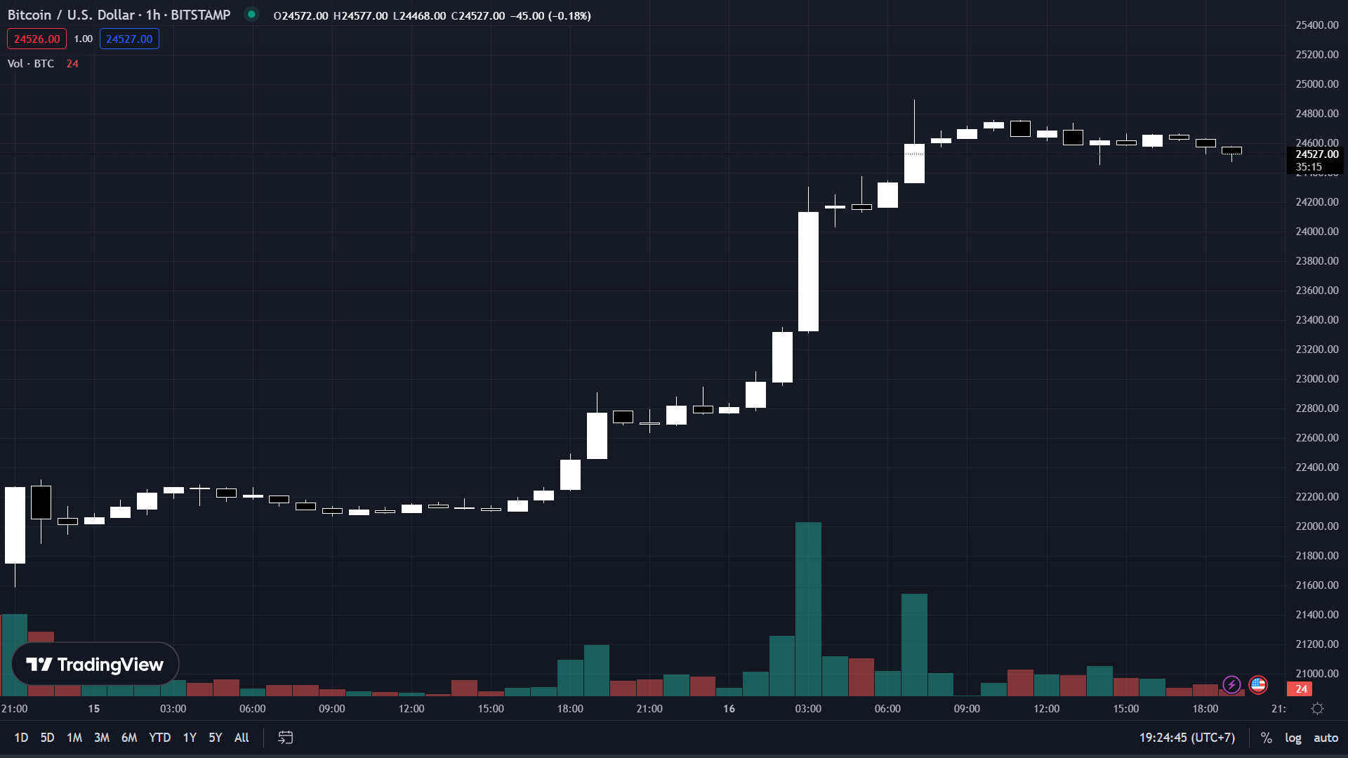 Sau khi bất ngờ tăng mạnh do hệ quả của một pha short squeezing, BTCUSD hiện ở $24,563.00