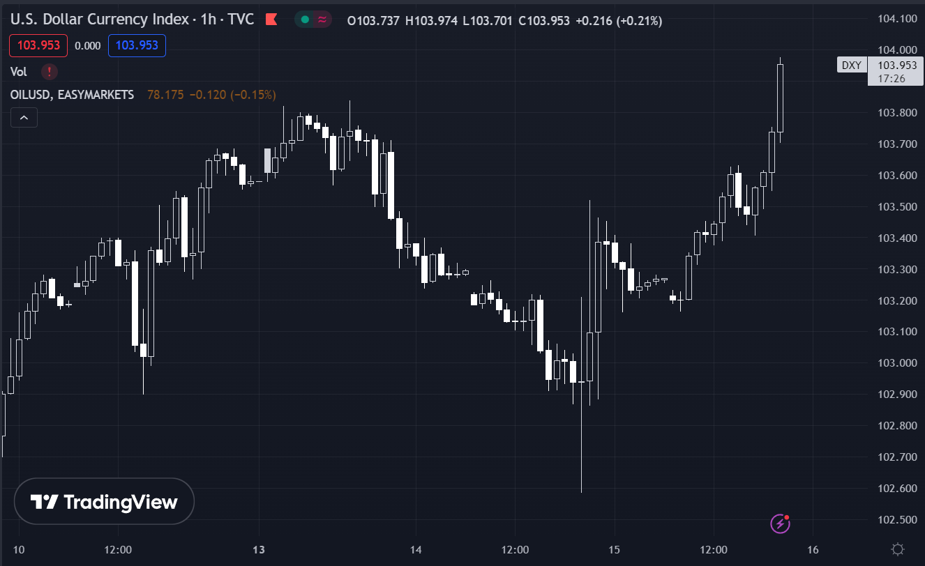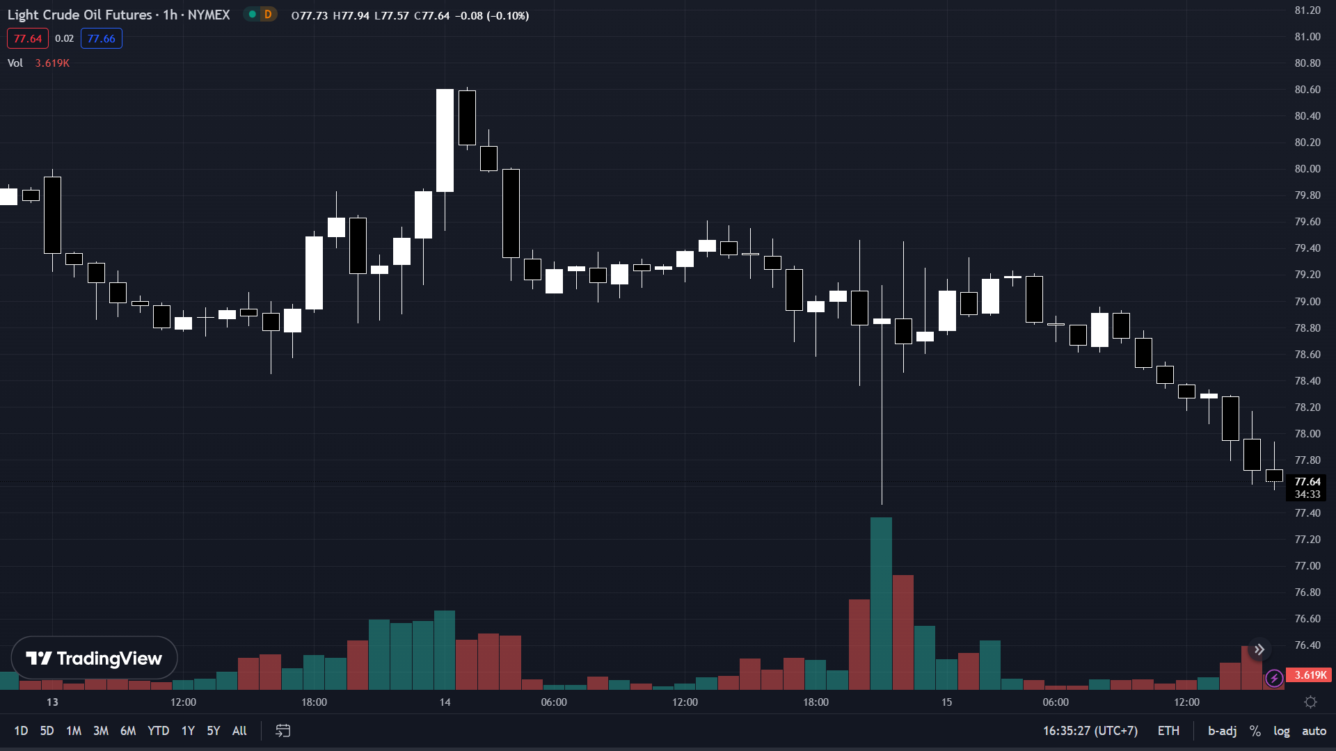 Dầu WTI tiếp tục giảm trong ngày, hiện đang ở mức 77.64.