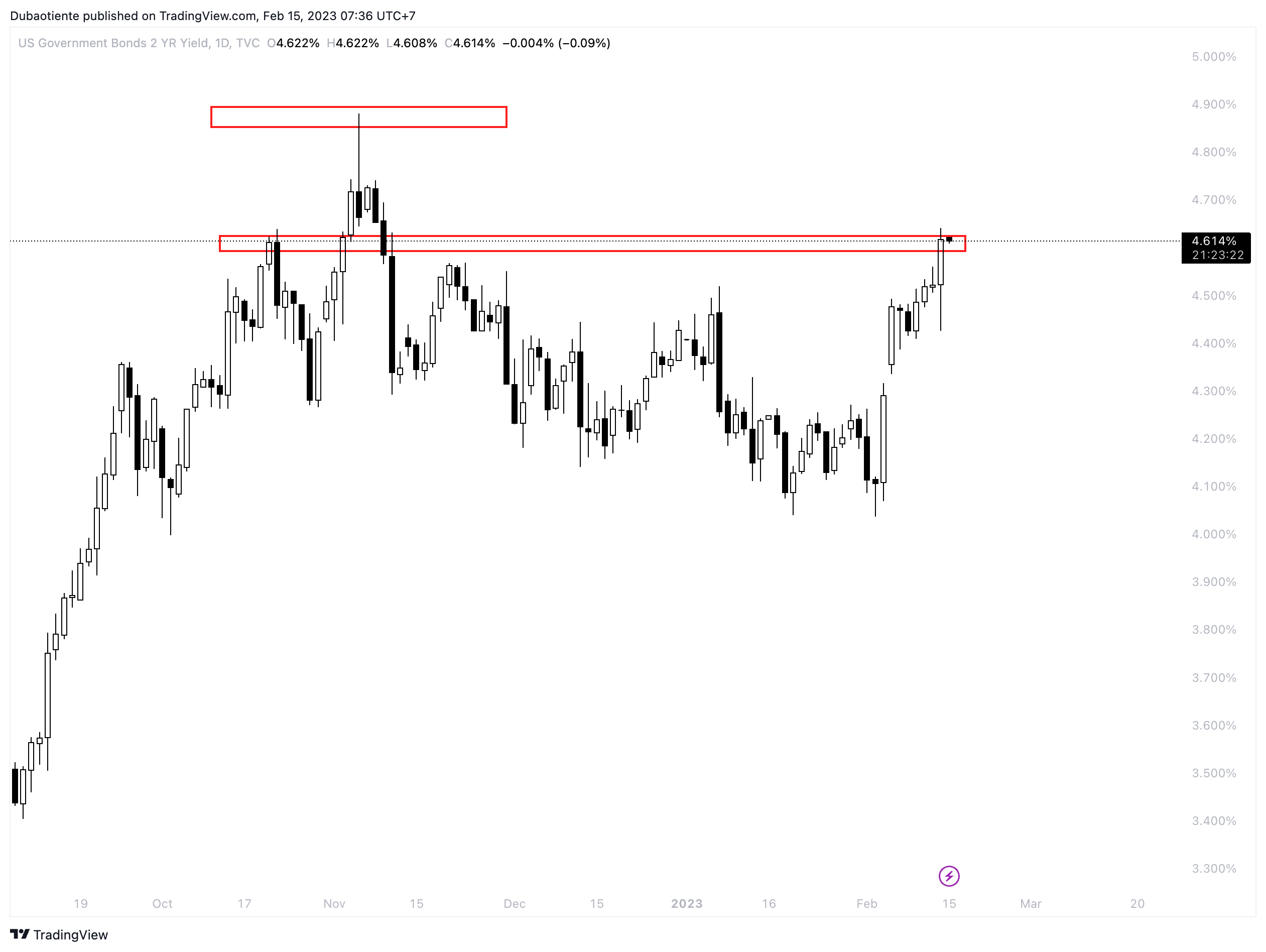 Lợi suất 2 năm cũng chốt phiên tăng 9bp, kiểm tra vùng đỉnh ngày 20/10/2022; ở trên đó sẽ là đỉnh chu kỳ tại 4.88%.