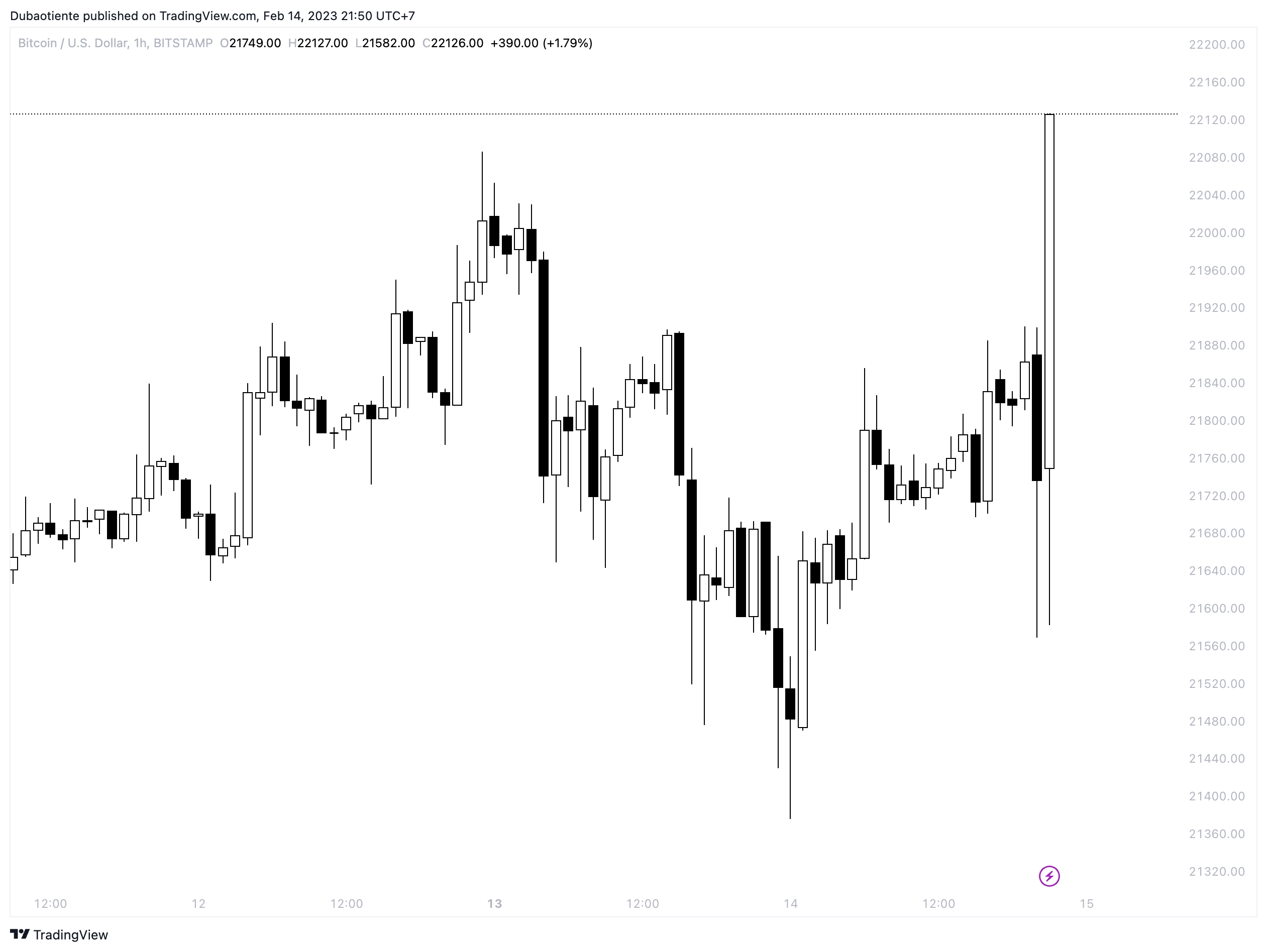 BTC chạm đỉnh phiên, kiểm tra $22k