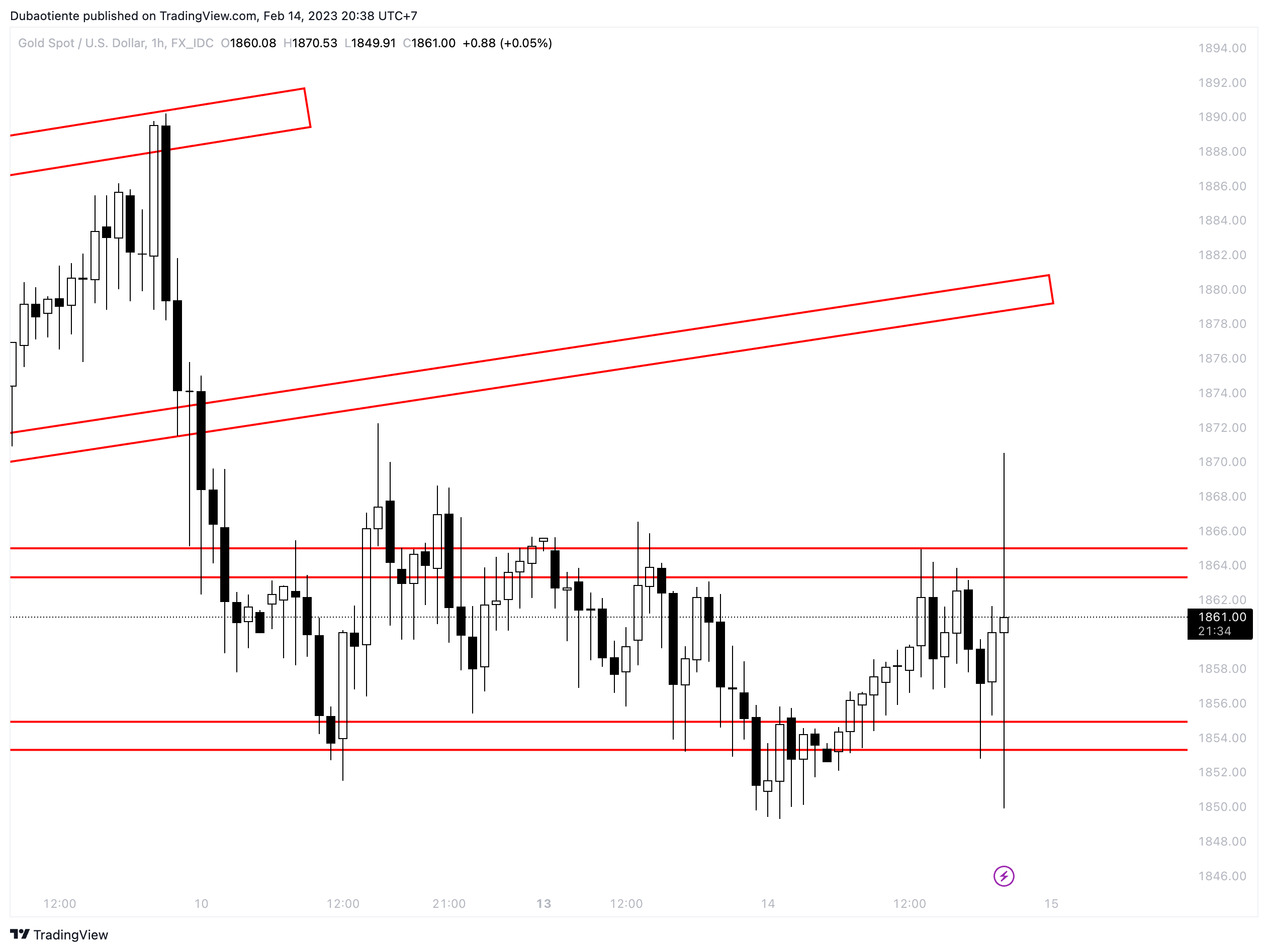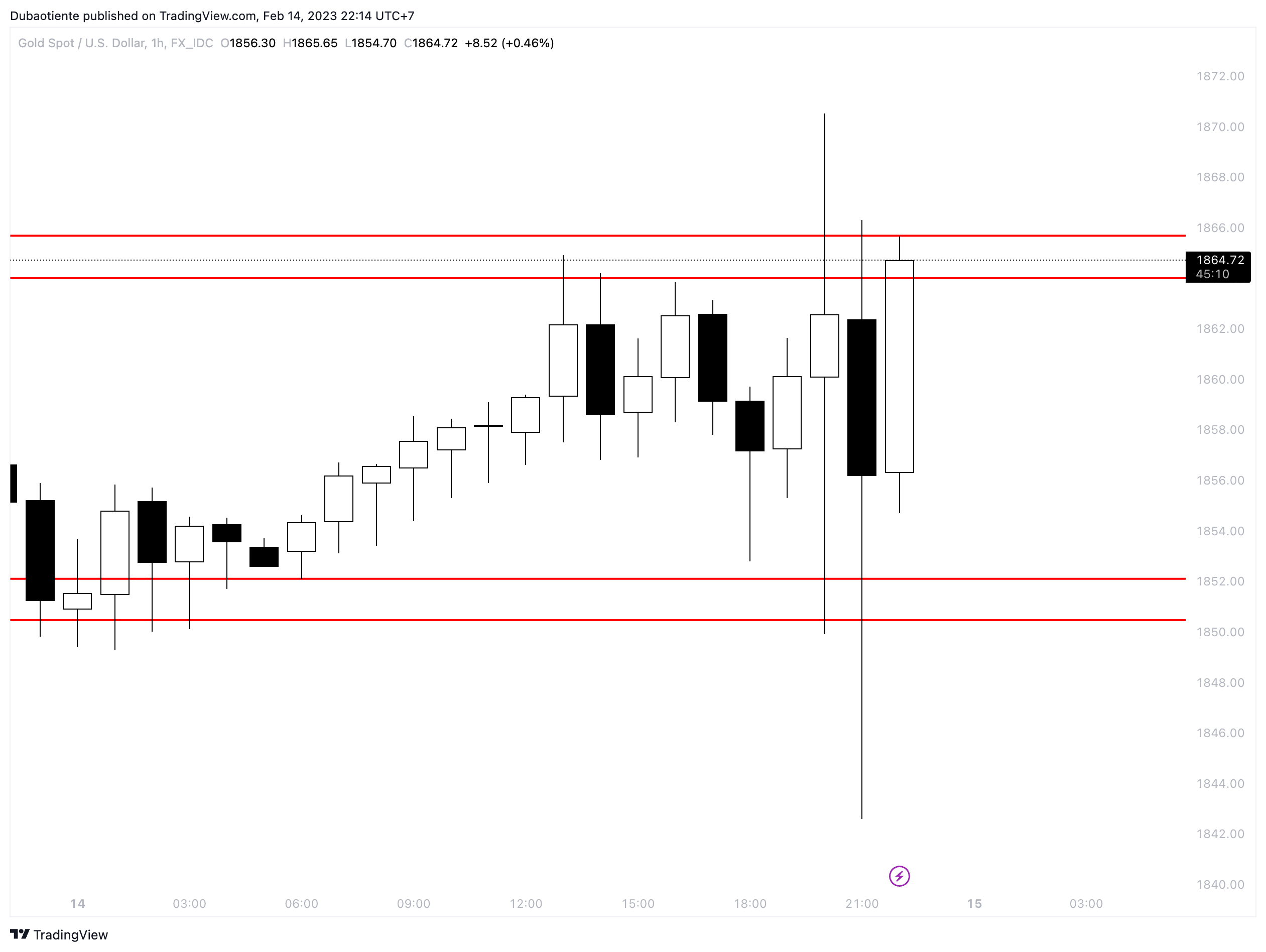 Sau khi giảm xuống hỗ trợ $1,850 sau báo cáo CPI, vàng đã bật tăng trở lại, kiểm tra kháng cự $1,865, có thời điểm tăng lên $1,871. Hiện tại vàng vẫn đang biến động khá mạnh.