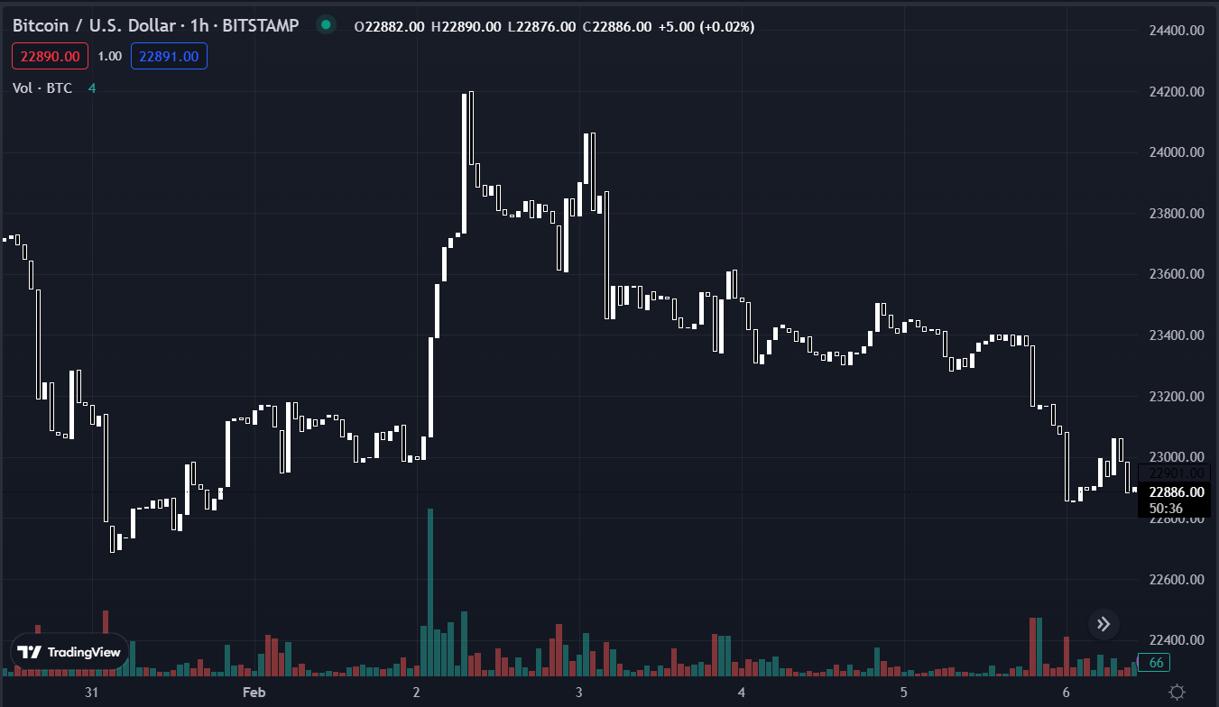 BTCUSD hiện giảm 0.22%, hiện ở $22,886.00.