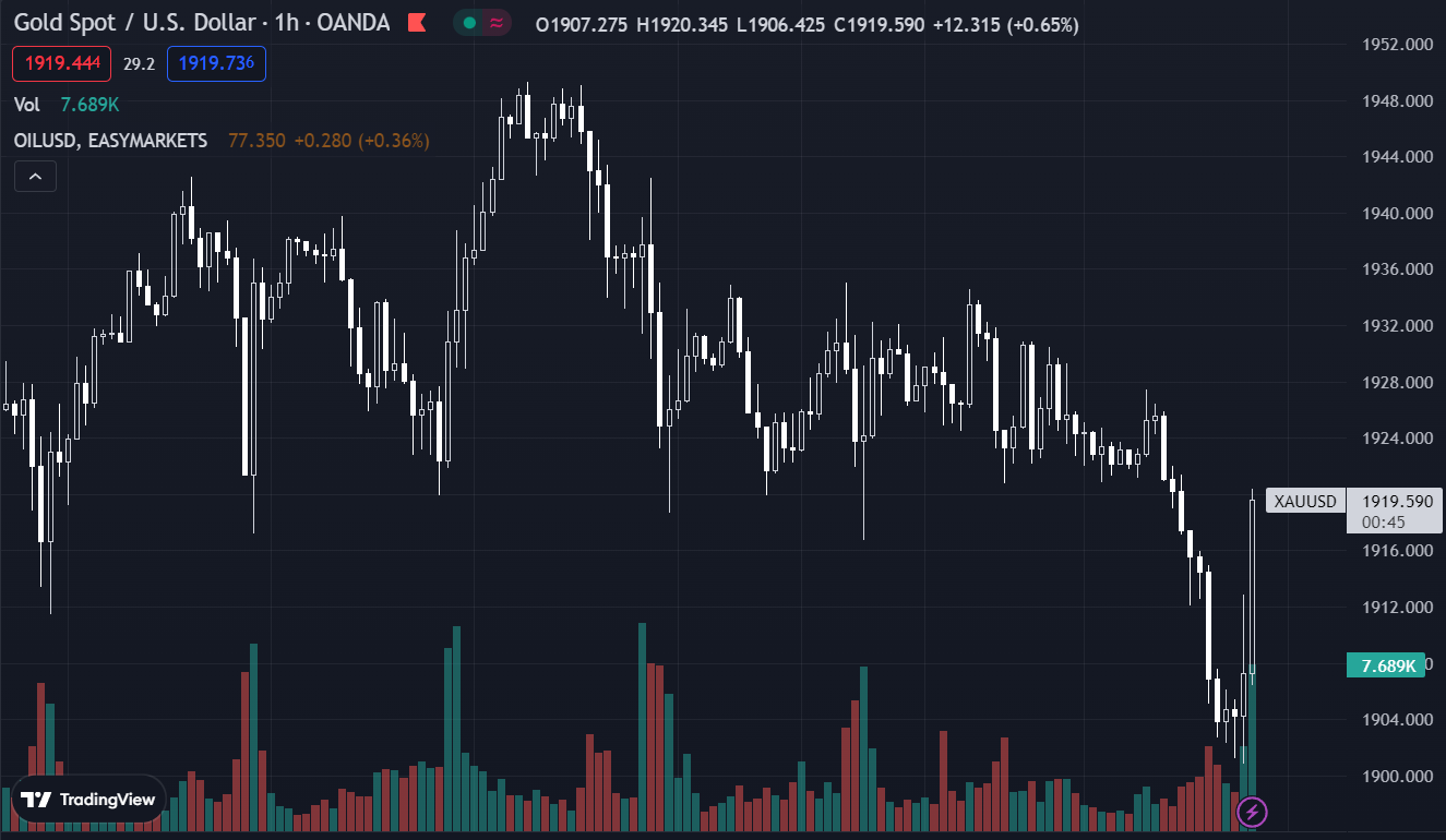 Giá vàng thế giới giảm sâu sát ngưỡng cản 1.900 USD/ounce trong bối cảnh chịu áp lực từ đồng USD, tuy nhiên đã nhanh chóng hồi phục lên 1928 USD Lợi suất trái phiếu 10 năm của Mỹ cũng giảm 3 bp xuống 3.507%. Giá dầu tăng 0.1% lên 79.03USD/thùng