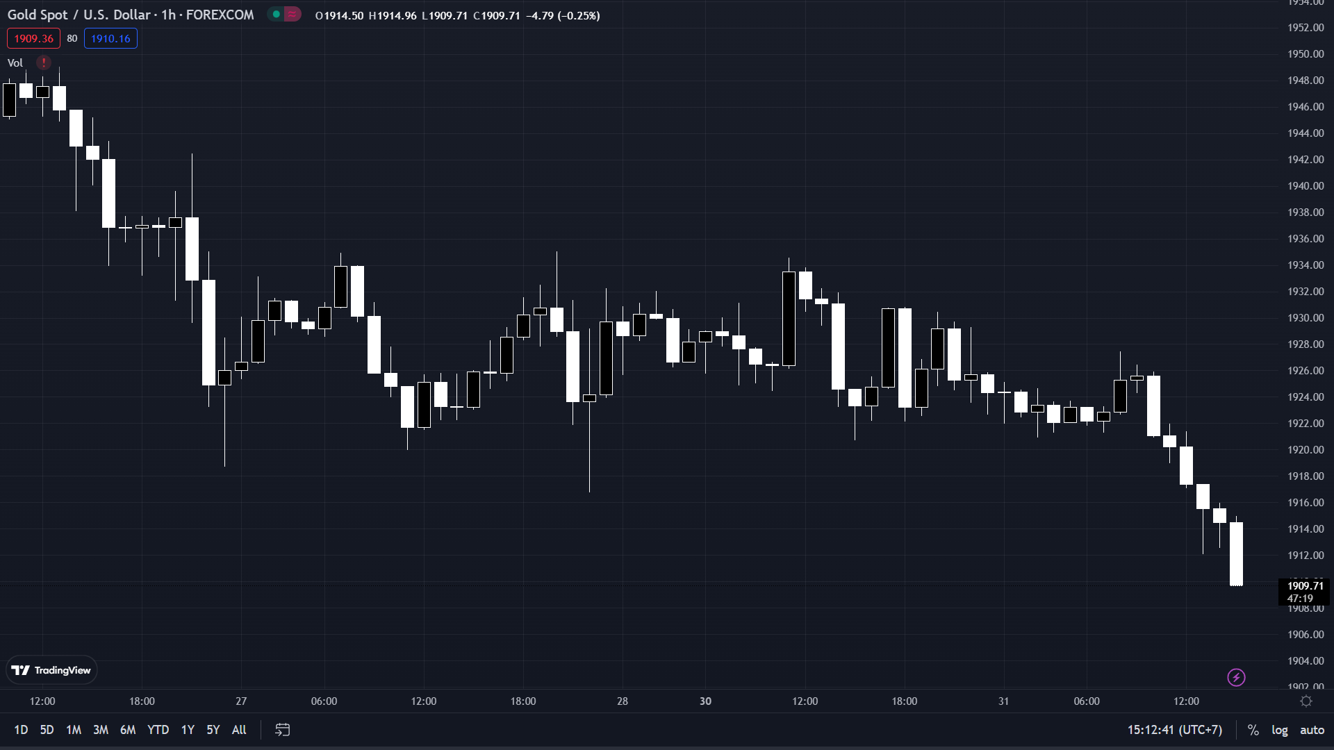 Vàng vẫn đang tiếp tục giảm trong ngày xuống dưới 1910 USD/oz. XAU/USD hiện đang ở 1909.71.