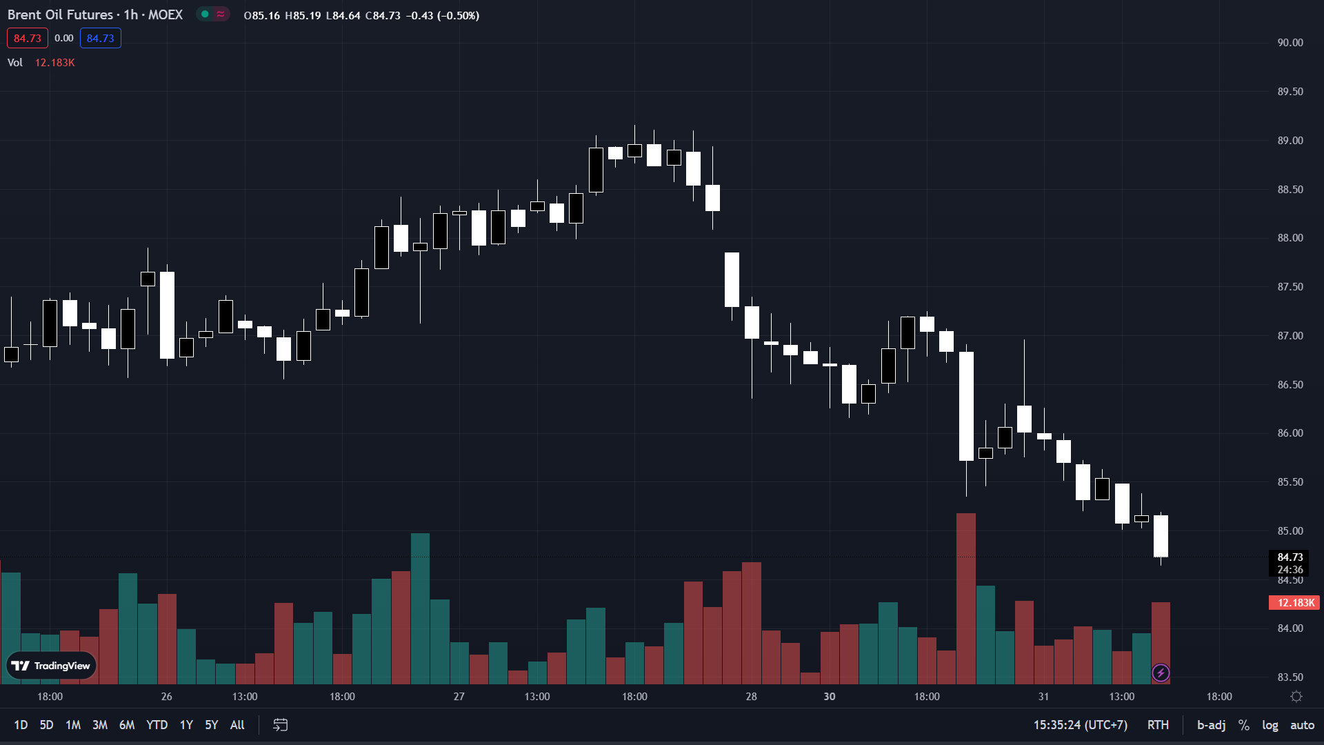 Dầu Brent hiện đang giảm gần 1.7% xuống 84.73 USD trong ngày.