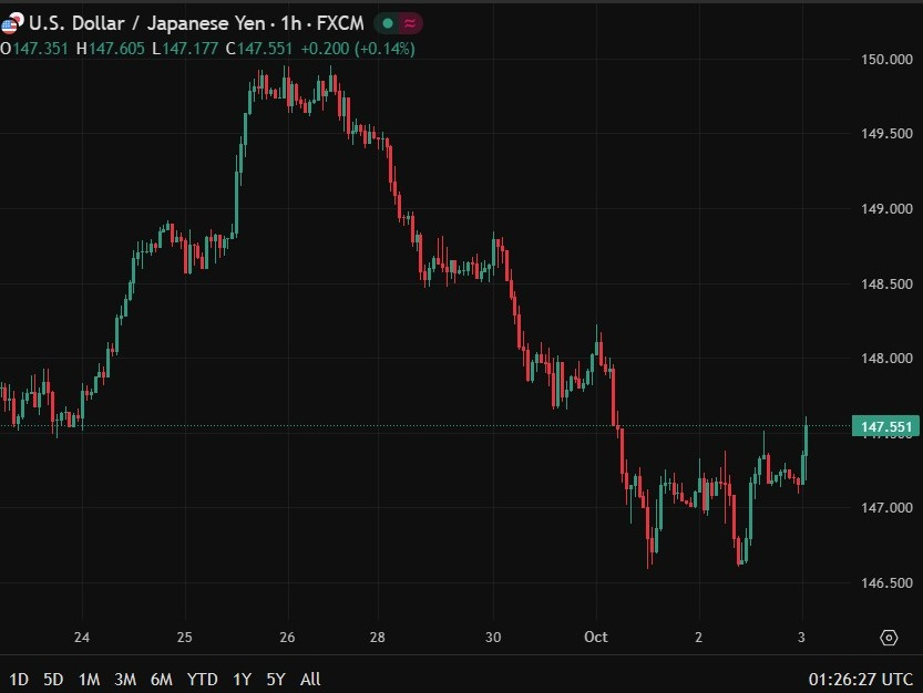 Chỉ số DXY hôm nay giảm xuống mức thấp nhất trong một tuần, chịu áp lực từ việc chính phủ Mỹ chính thức đóng cửa. Đồng bạc xanh nối dài đà suy yếu sau khi báo cáo việc làm khu vực tư nhân (ADP) tháng 9 bất ngờ ghi nhận tháng thứ hai liên tiếp sụt giảm, làm gia tăng kỳ vọng Cục Dự trữ Liên bang (Fed) sẽ hạ lãi suất tại cuộc họp ngày 28–29/10 lên tới 100% theo định giá trên thị trường hoán đổi. Tuy nhiên, mức giảm của USD được hạn chế nhờ chỉ số sản xuất ISM tháng 9 tăng mạnh hơn dự báo, đạt mức cao nhất trong 7 tháng. Trong khi đó, đồng yên tăng lên đỉnh hai tuần so với USD nhờ lực cầu trú ẩn an toàn trước bối cảnh chính phủ Mỹ ngừng hoạt động, đồng thời được hỗ trợ bởi loạt số liệu kinh tế tích cực từ Nhật Bản: chỉ số Tankan sản xuất lớn quý III cải thiện và PMI sản xuất S&P tháng 9 được điều chỉnh tăng. Đà tăng của JPY còn được củng cố sau khi lợi suất trái phiếu kho bạc Mỹ sụt giảm do báo cáo việc làm ADP yếu hơn dự kiến.