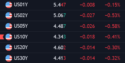 • Lợi suất trái phiếu kho bạc đồng loạt giảm. Lợi suất trái phiếu kỳ hạn 10 năm giảm 2.2 điểm cơ bản xuống 4.344%