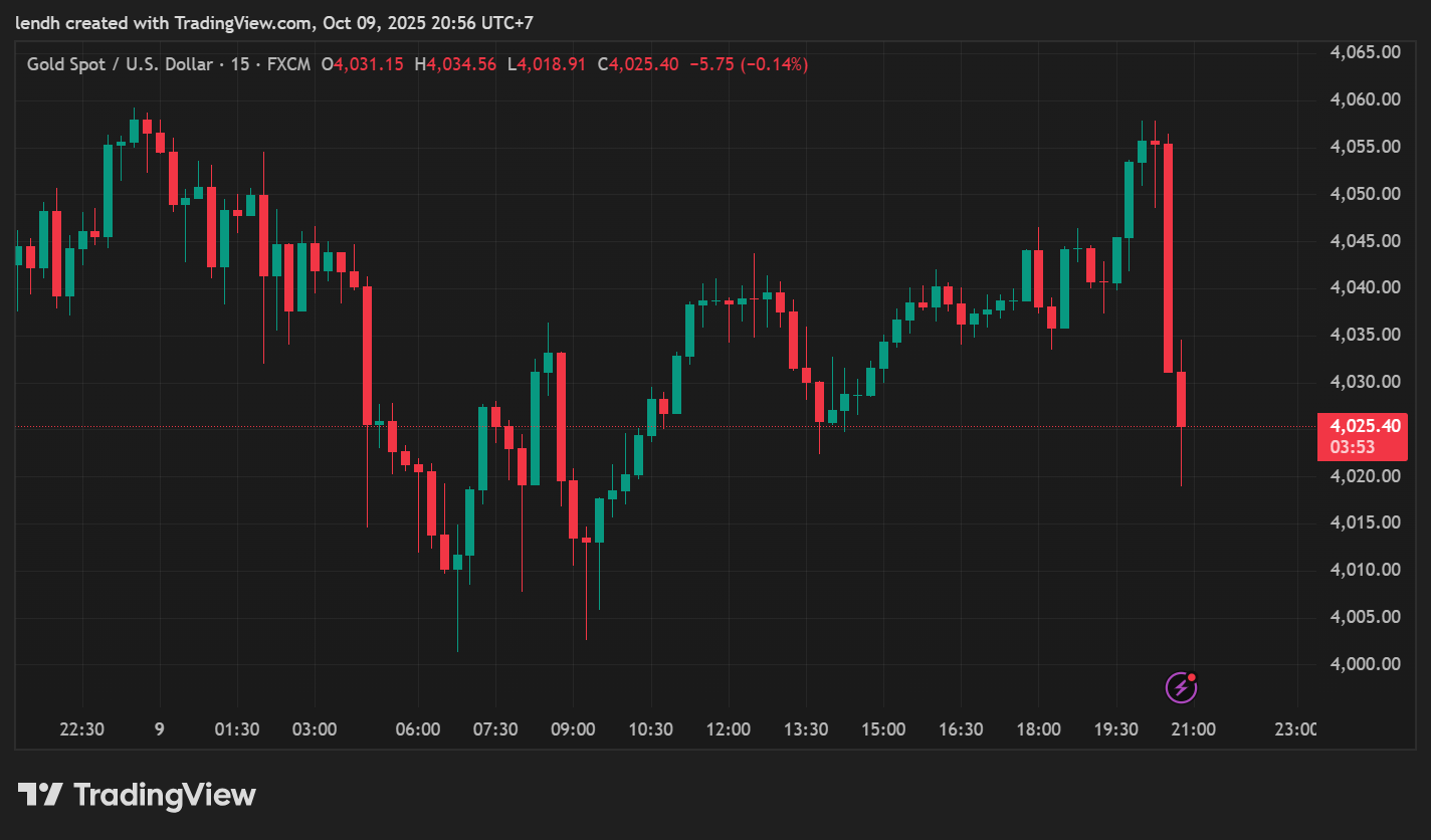 Trong khi đó, giá vàng cũng đang tiếp tục xu hướng đi lên, hiện giao dịch tăng nhẹ 1.50 USD lên mức 4,042 USD/ounce. Kể từ ngày 2/9 – khi giá vàng vượt mốc 3,500 USD thiết lập hồi tháng 4 – kim loại quý này liên tục ghi nhận các đỉnh cao mới, xen kẽ với một số phiên điều chỉnh. Mức cao nhất trong phiên hôm nay ghi nhận tại 4,046.71 USD, sau khi mức đỉnh mọi thời đại ngày hôm qua dừng lại ở 4,059.31 USD.