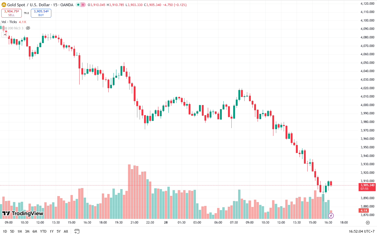Giá vàng tiếp tục lao dốc trong phiên thứ ba liên tiếp, rơi xuống mức thấp nhất trong ba tuần khi tâm lý lạc quan về triển vọng thương mại Mỹ–Trung làm giảm nhu cầu trú ẩn an toàn. giá vàng hiện dao động quanh mức 3,900 USD/Oz