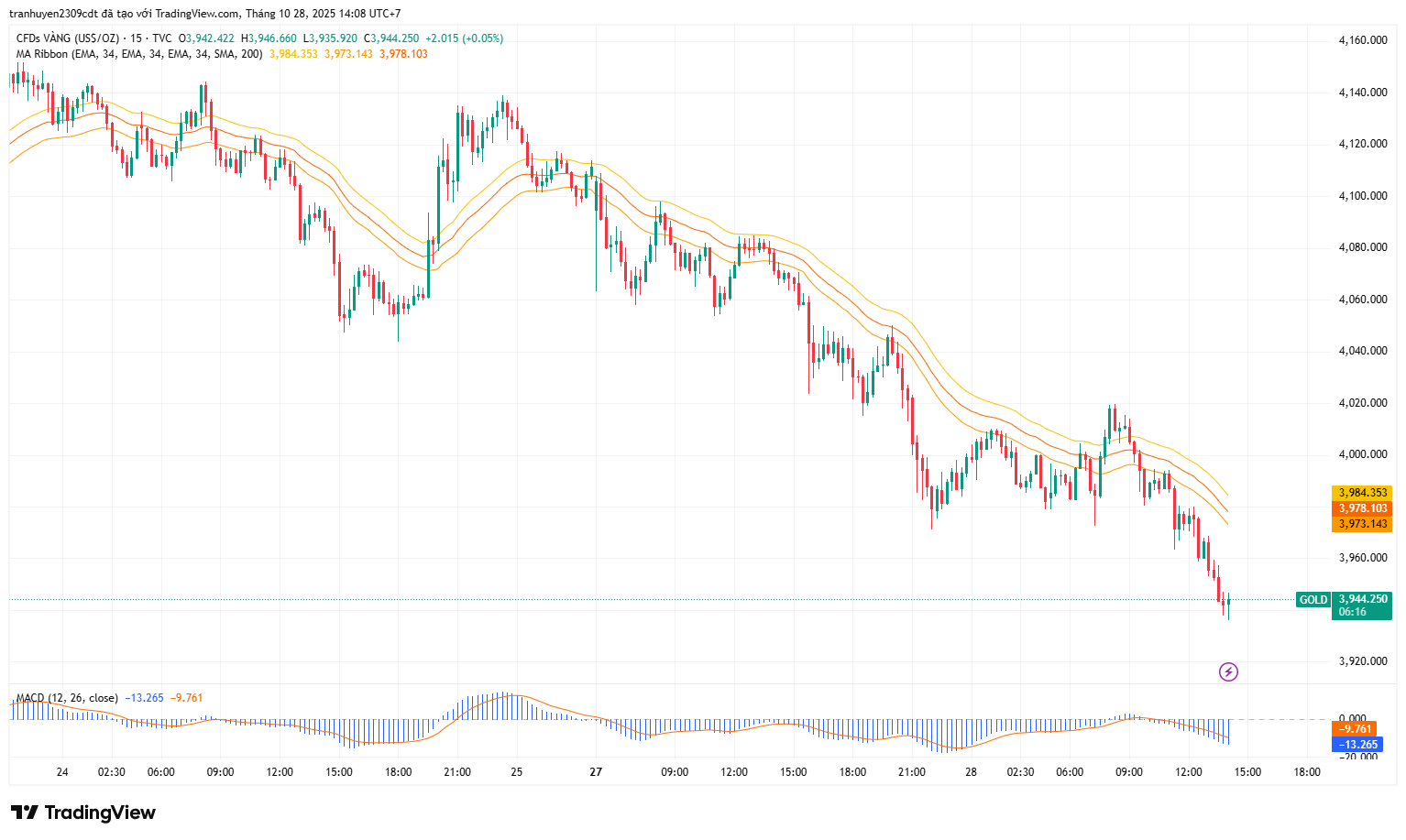 Vàng đang ở mức đáy giai đoạn 10 tháng 10 khi nó giảm 125 USD để phá vỡ mốc 4,000 USD.