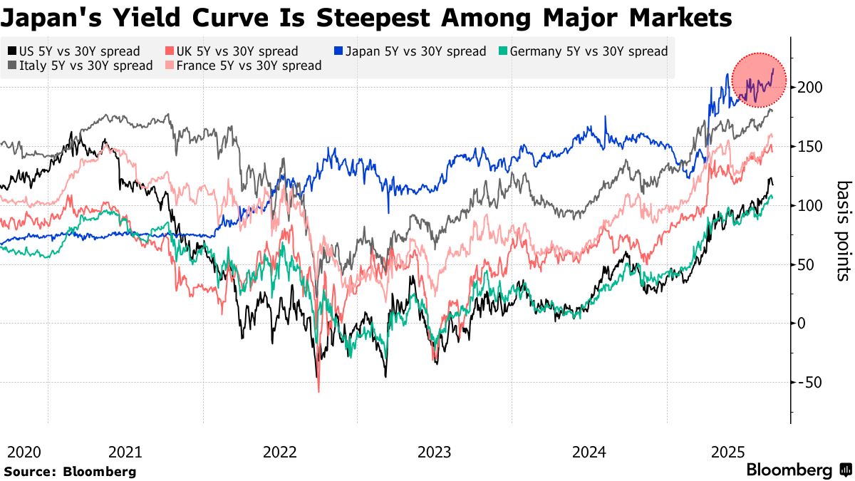 Lợi suất kỳ hạn 30 năm đã tăng 6 điểm cơ bản, đạt mức cao kỷ lục của tuần trước, làm gia tăng khoảng cách so với trái phiếu kỳ hạn 5 năm, mức chênh lệch này đã mở rộng vượt xa so với những gì hiện đang thấy ở các thị trường lớn khác.