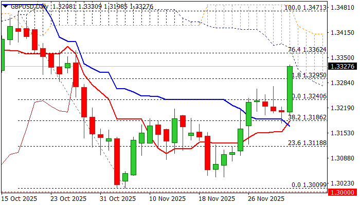 Đợt tăng này đã phá vỡ mức kháng cự 1.3295 (Fibo 61.8% của 1.3471/1.3009 / 55DMA) và vượt lên trên 200DMA (1.3319), tiến gần một rào cản quan trọng khác do phần đáy của đám mây Ichimoku khung ngày đang dần hạ thấp tạo thành.