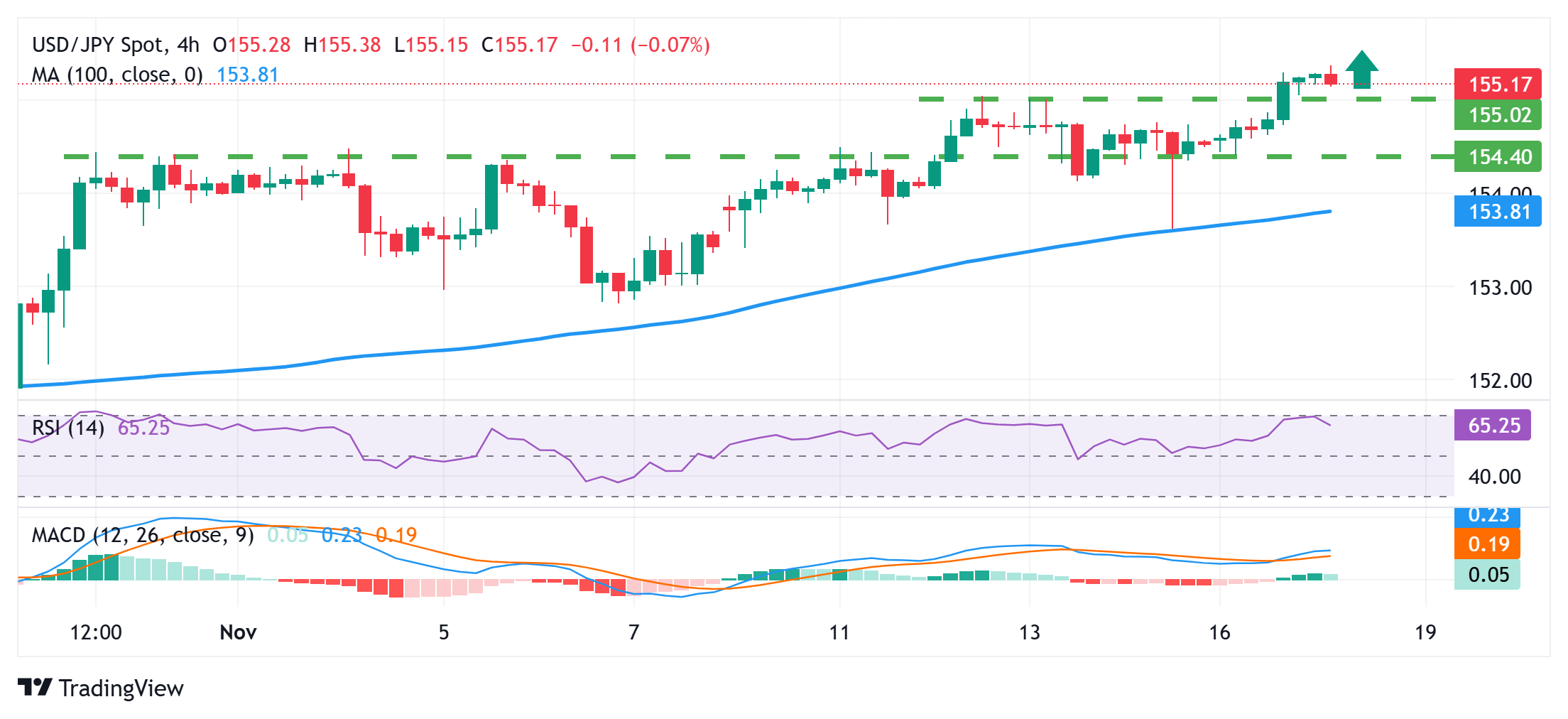 Phân tích kỹ thuật: USD/JPY có triển vọng tăng thêm; mốc 155.00 tiếp tục được theo dõi