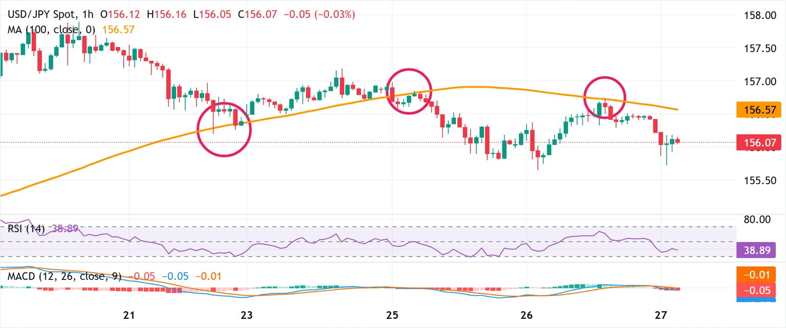 Phân tích kỹ thuật: Phe gấu USD/JPY chiếm ưu thế khi giá nằm dưới đường trung bình động 100 giờ quanh 156.70