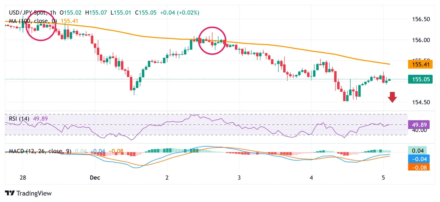 USD/JPY vẫn suy yếu dưới SMA 100 khung giờ quanh 155.40