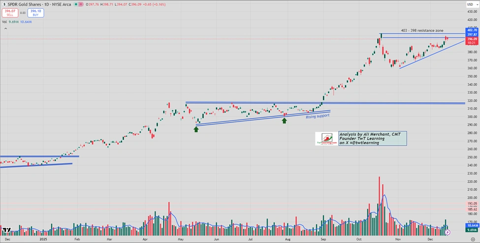 - GLD tiếp tục bị từ chối tại vùng kháng cự 398–403 trong phiên thứ hai liên tiếp.