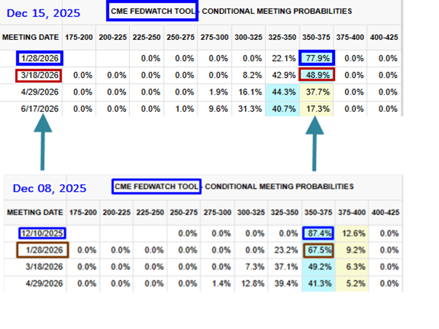 - Xác suất cắt giảm lãi suất trong tháng 1 theo CME FedWatch đã giảm xuống 77.90% hôm nay, từ mức 87.4% vào ngày 08 tháng 12 năm 2025.