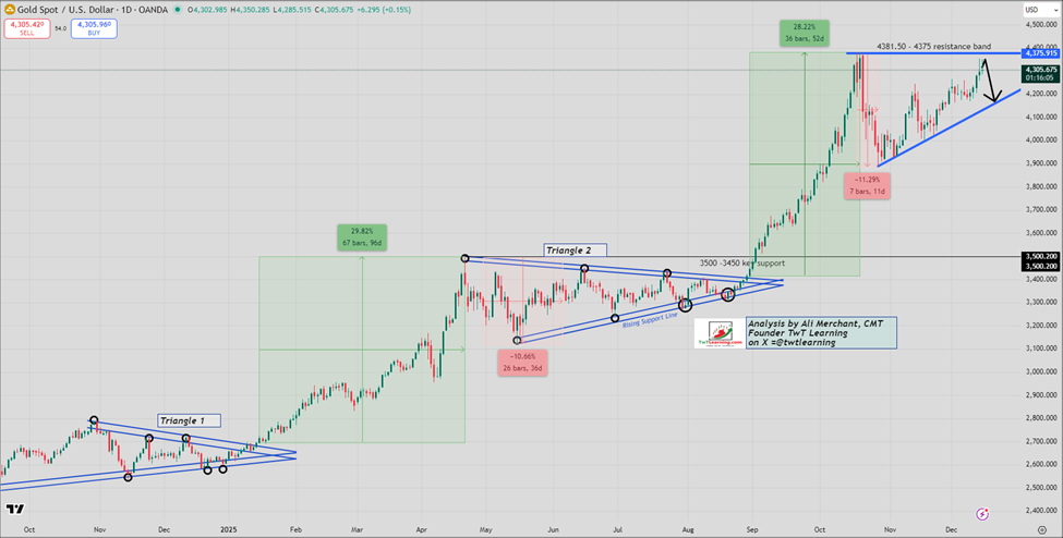 - Nếu phe mua không thể vượt qua vùng cản 4,381 USD trong tuần này, kịch bản điều chỉnh về khu vực 4,140 USD, tương ứng với đường xu hướng tăng hình thành từ cuối tháng 10, được đánh giá là khả thi.