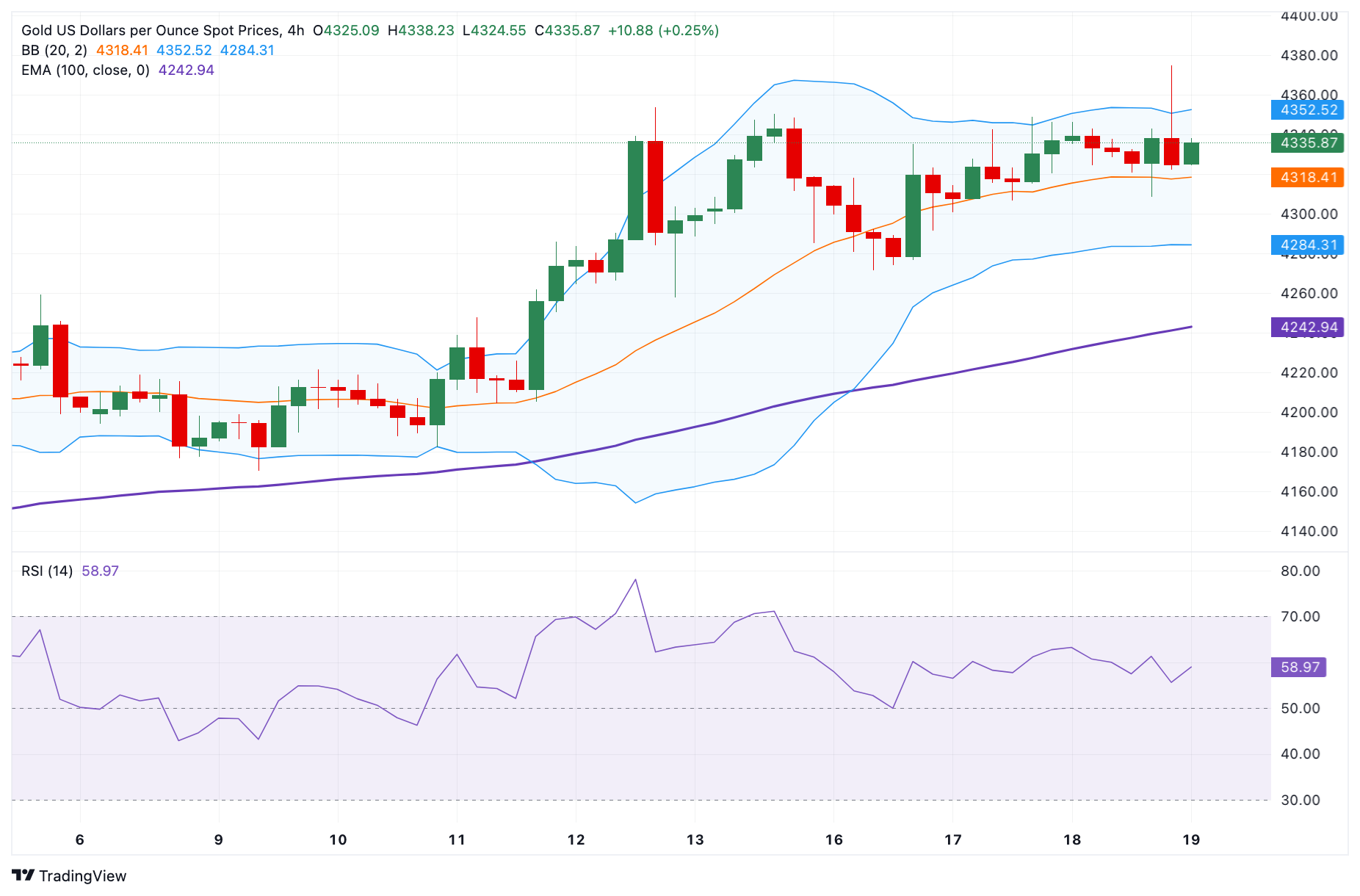 Ngưỡng cản tăng đầu tiên của XAU/USD nằm tại biên trên của dải Bollinger Band quanh mốc 4,352 USD. Một cú bứt phá rõ ràng trên vùng này có thể xác nhận lực mua quay trở lại, mở đường cho giá hướng tới mức đỉnh lịch sử 4,381 USD và xa hơn là mốc tâm lý 4,400 USD.