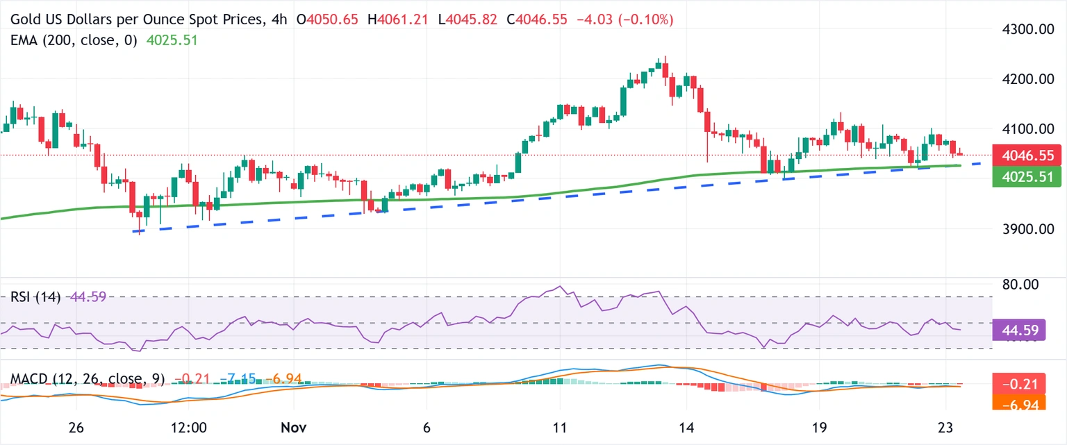 Xét trên góc độ kỹ thuật, cặp XAU/USD đến nay vẫn giữ được đường xu hướng tăng hình thành từ cuối tháng 10. Vùng hỗ trợ này hiện nằm quanh 4,030 USD, trùng với EMA 200 kỳ trên biểu đồ 4 giờ, đóng vai trò là điểm xoay then chốt. Nếu khu vực này bị xuyên thủng dứt khoát, Vàng có thể mở rộng đà giảm về dưới ngưỡng tâm lý 4,000 USD và kiểm tra vùng đáy tuần trước tại 3,968–3,967 USD. Nếu xu hướng giảm tiếp diễn, giá có thể lùi sâu về hỗ trợ 3,931 USD, trước khi hướng xuống khu vực 3,900 USD và vùng đáy cuối tháng 10 quanh 3,886 USD.