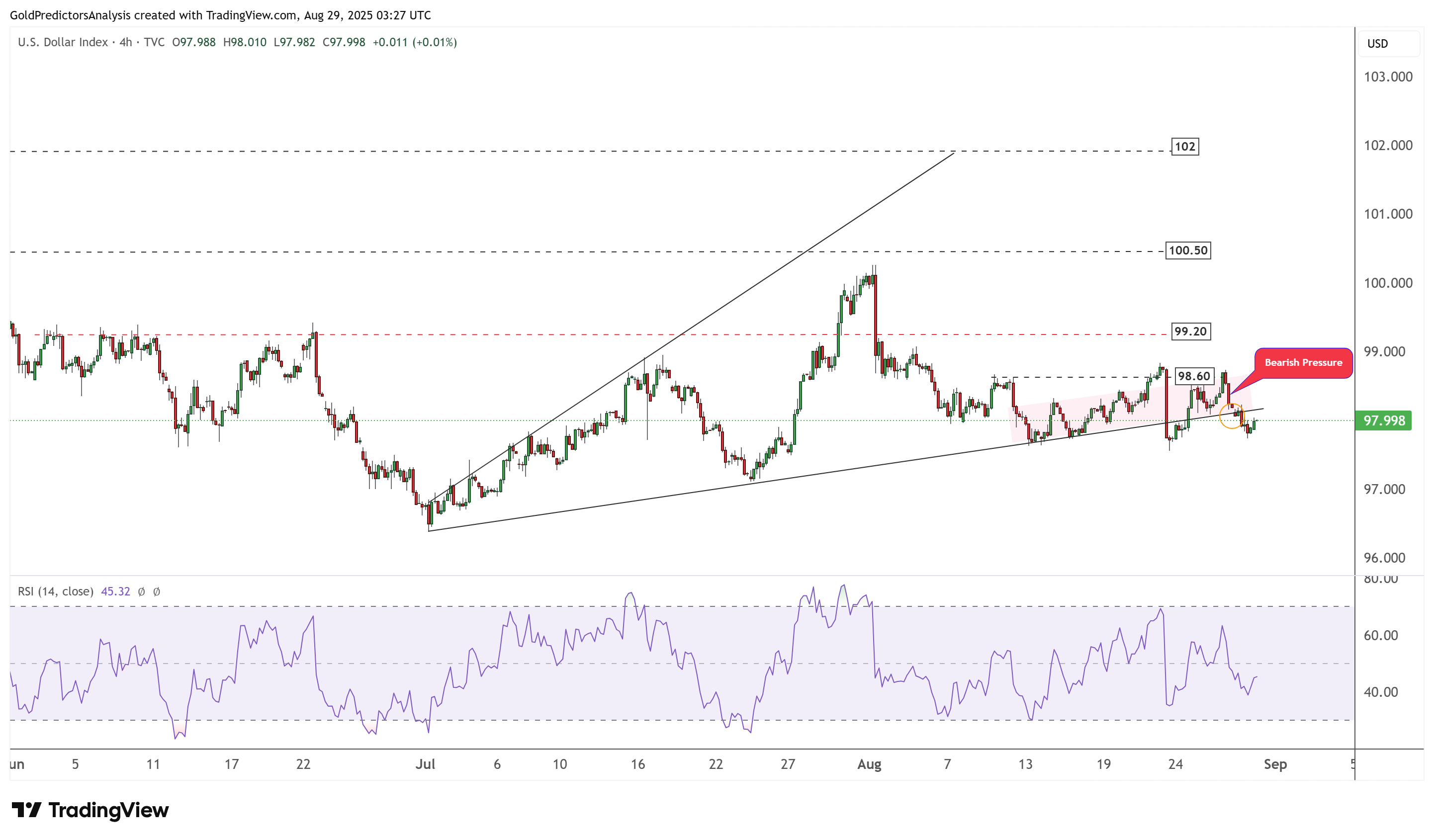 USD 4 giờ củng cố tại vùng hỗ trợ, nghiêng về khả năng giảm. Sự củng cố này báo hiệu áp lực giảm kéo dài, tăng xác suất đợt bứt phá tiếp theo sẽ theo hướng giảm, tiếp tục hỗ trợ các tài sản trú ẩn.