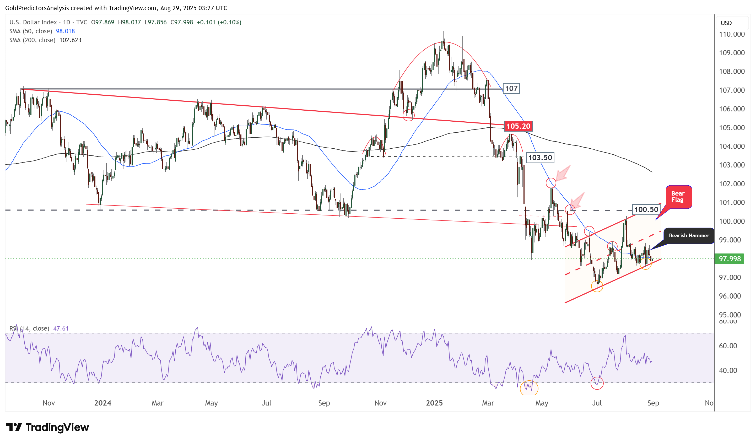 Chỉ số USD đang củng cố trong mô hình cờ giảm, với mức kháng cự 100,50. Biên dưới lá cờ cho thấy khả năng giảm giá cao. Phá vỡ dưới 97 sẽ mở đầu động thái hướng tới 96, và nếu giảm tiếp dưới 96, mục tiêu tiếp theo là 90. Suy yếu của đồng USD sẽ thúc đẩy giá vàng và bạc tăng mạnh.