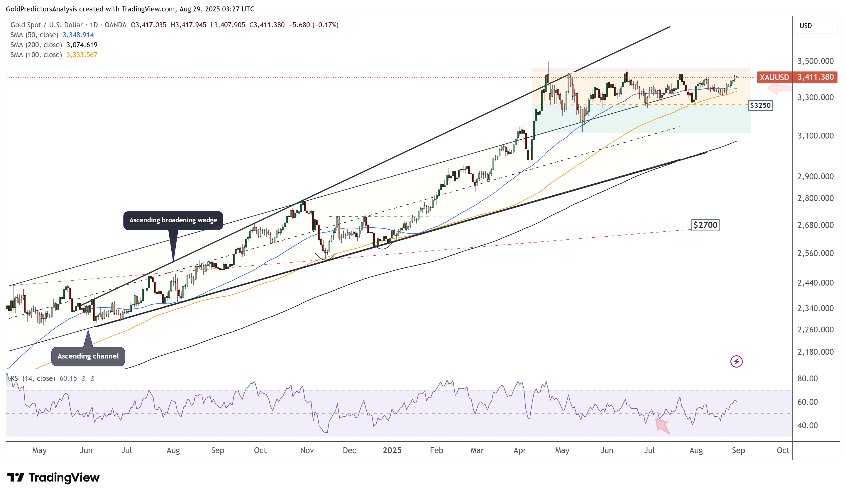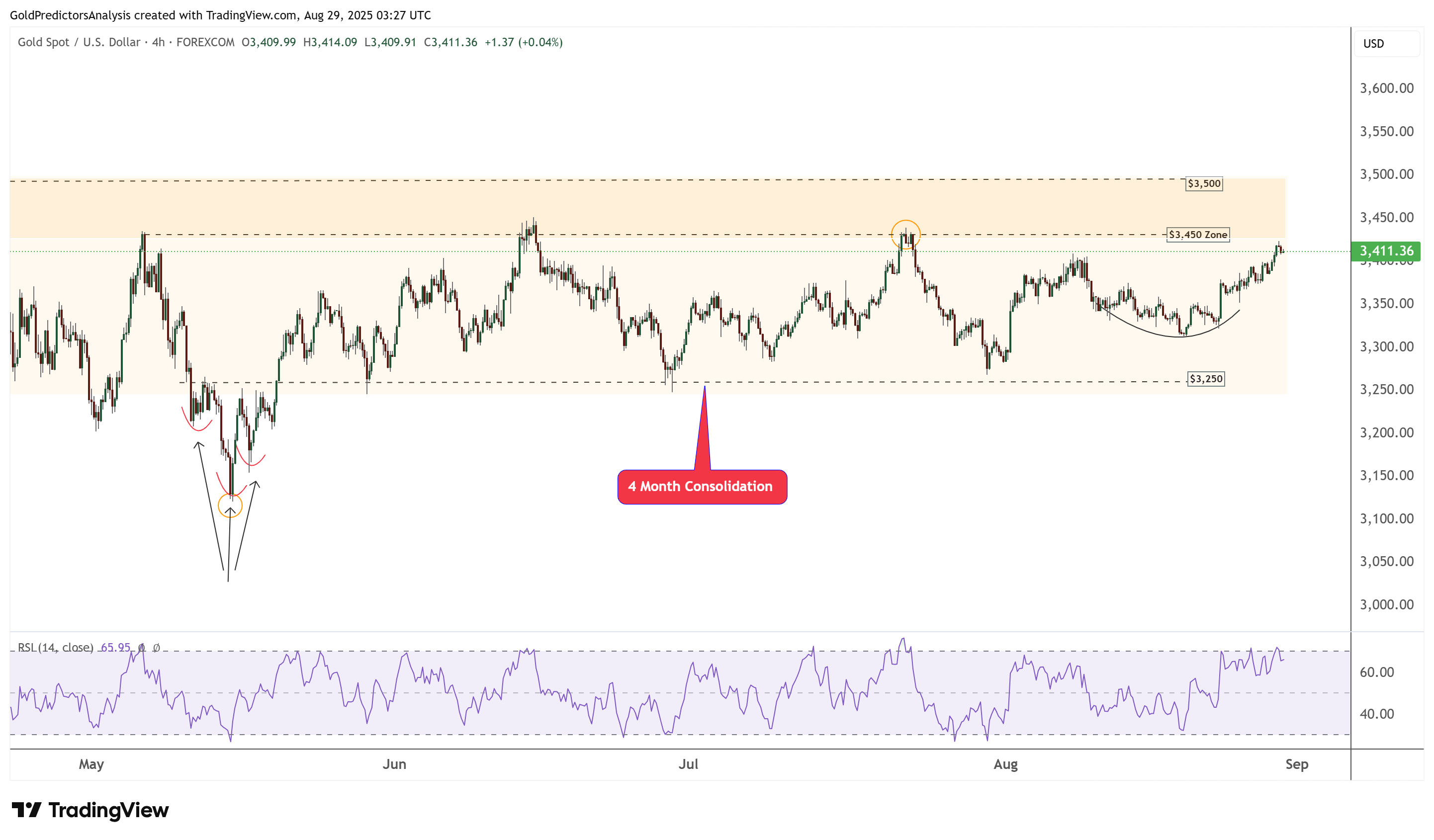Hiện giá vàng củng cố trong phạm vi 3,250–3,450 USD. Sự đi ngang này tăng khả năng bứt phá lên trên 3,500 USD, mở ra đà tăng tiếp theo khi giai đoạn điều chỉnh theo mùa kết thúc.