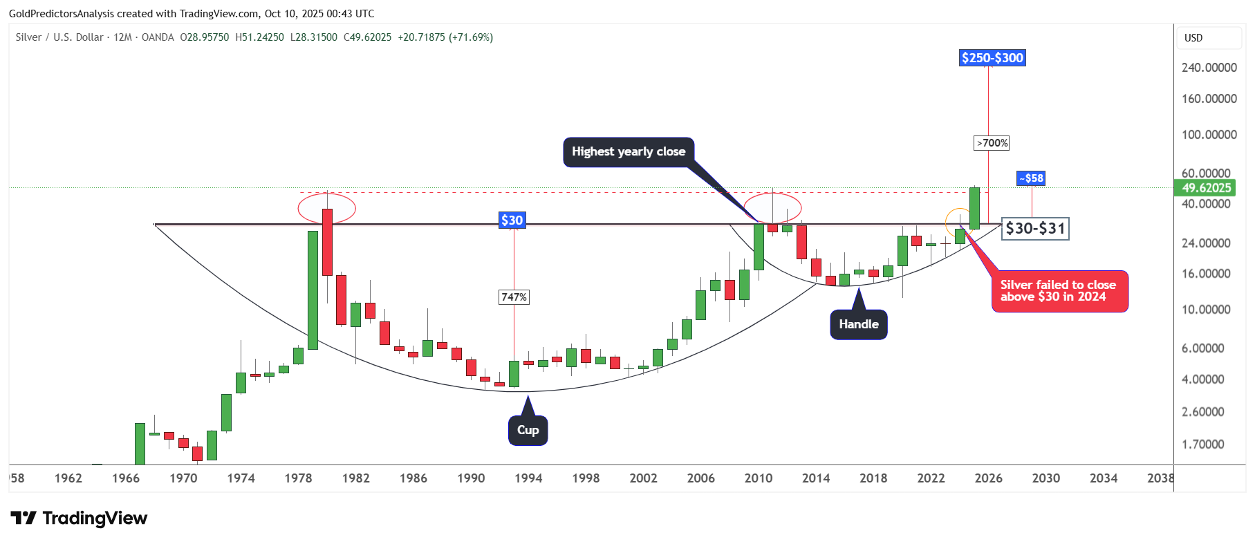 Nếu giá bạc duy trì đóng cửa trên 31 USD, điều này sẽ xác nhận một đợt bứt phá lớn, mở ra tiềm năng tăng giá về vùng 250–300 USD trong vài năm tới, tương đương mức tăng 700% tính từ điểm bứt phá 31 USD. Mục tiêu này được tính dựa trên chiều cao của mô hình “cốc và tay cầm”.