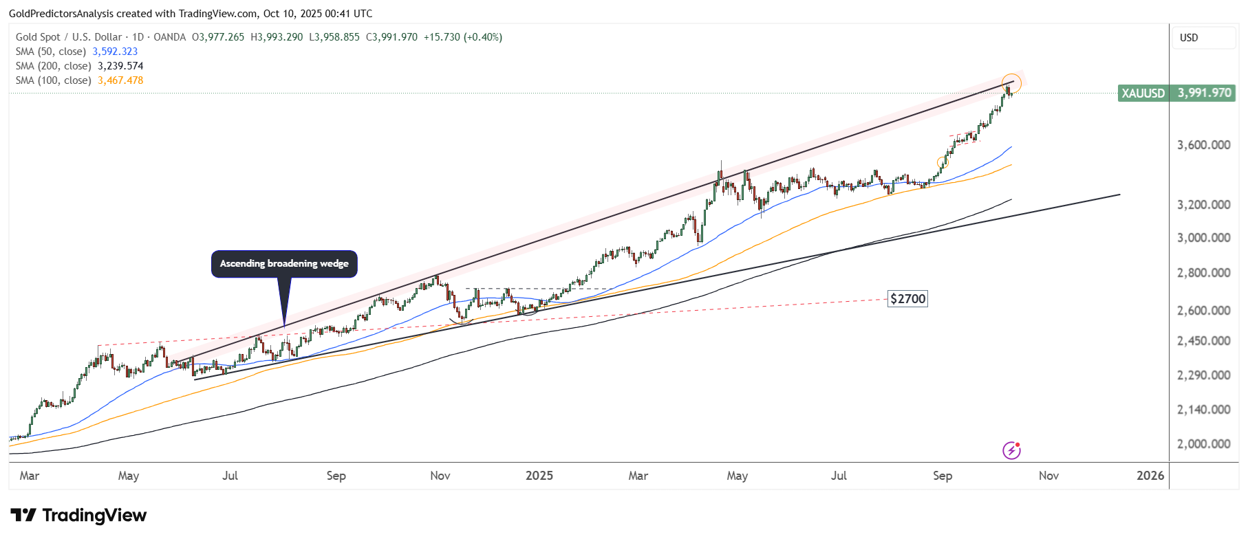 Trên biểu đồ khung ngày, vàng đang chạm vùng kháng cự kỹ thuật mạnh quanh 4,000 USD. Với biến động lớn, vùng kháng cự này được xác định trong khoảng 4,000–4,200 USD. Nếu giá vượt 4,100 USD, đà tăng có thể tiếp tục mở rộng.