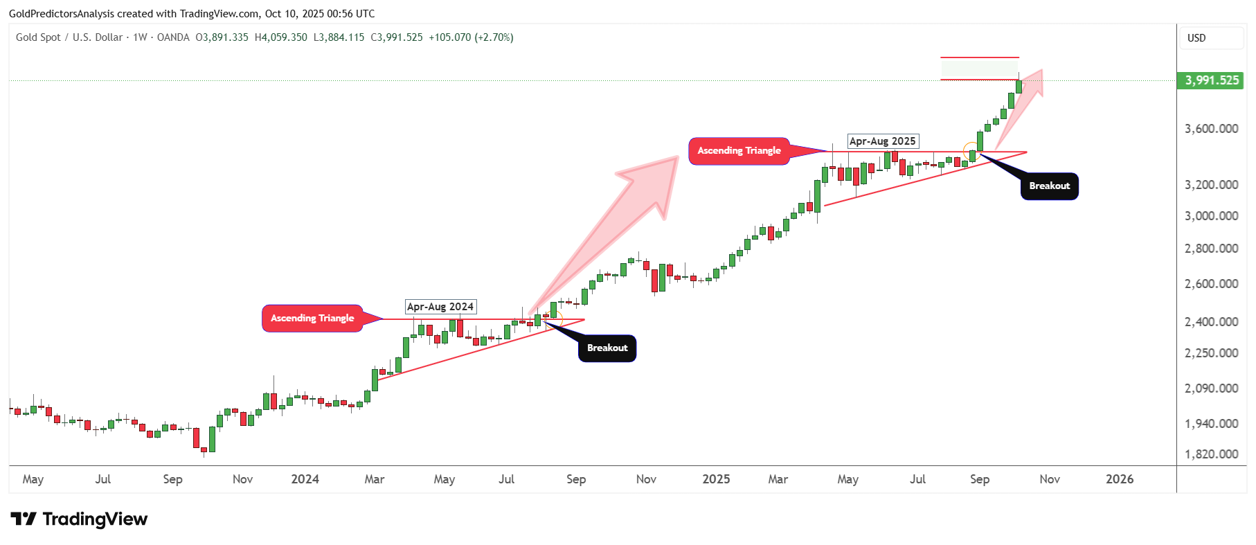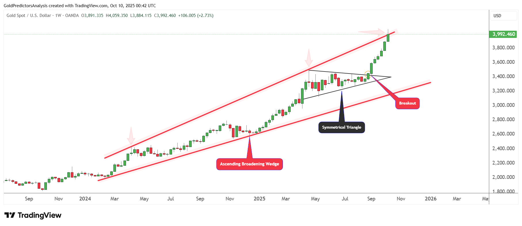 Một mô hình tam giác tăng tương tự đã hình thành từ tháng 4 đến tháng 8/2025, và đợt bứt phá tháng 9/2025 lại kích hoạt chu kỳ tăng mới. Sau nhiều tuần đi lên, đỉnh tháng 10 có thể là đỉnh năm 2025, trước khi bước vào giai đoạn điều chỉnh trong tháng 11.