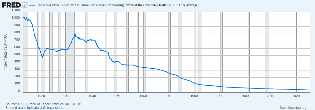 Đồng USD đã mất hơn 90% sức mua kể từ năm 1960, theo dữ liệu CPI, và mức sụt giảm này còn nghiêm trọng hơn nếu đo bằng vàng.