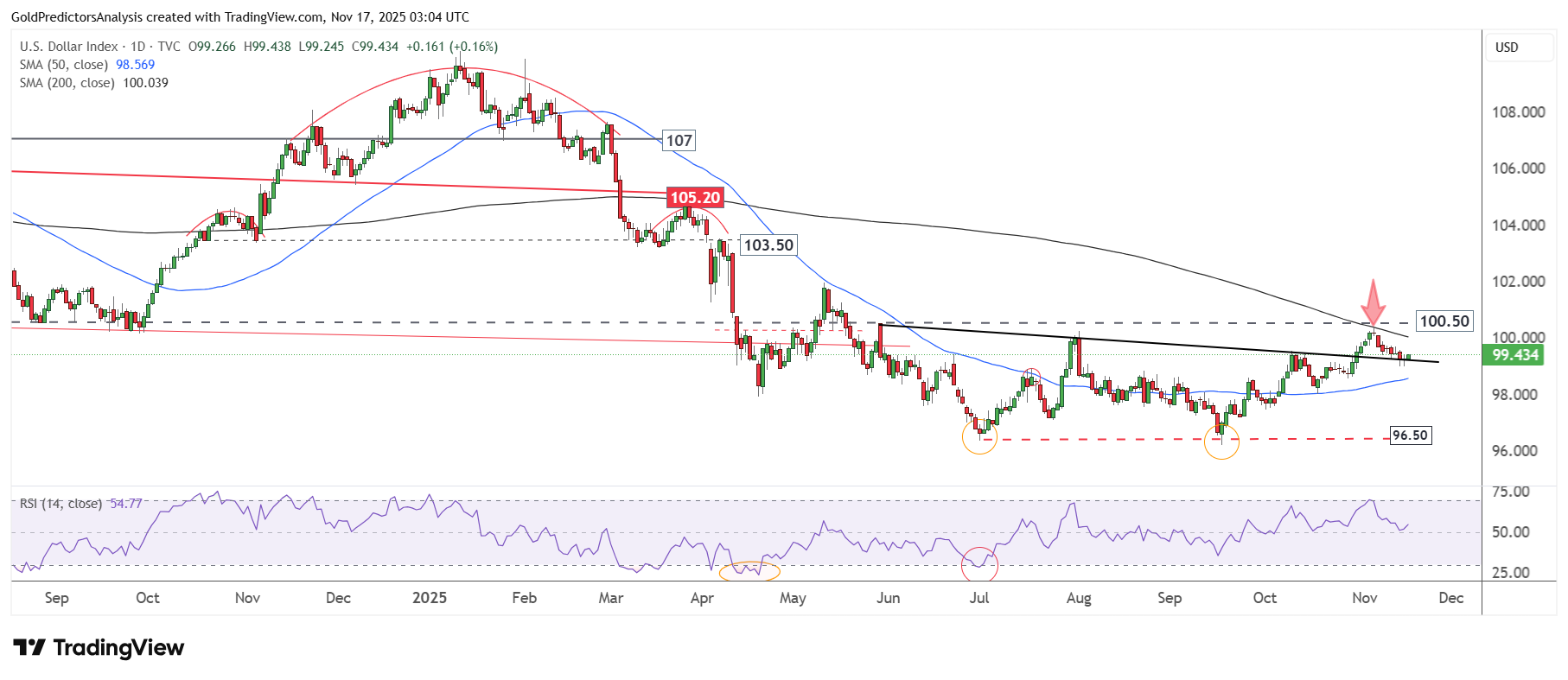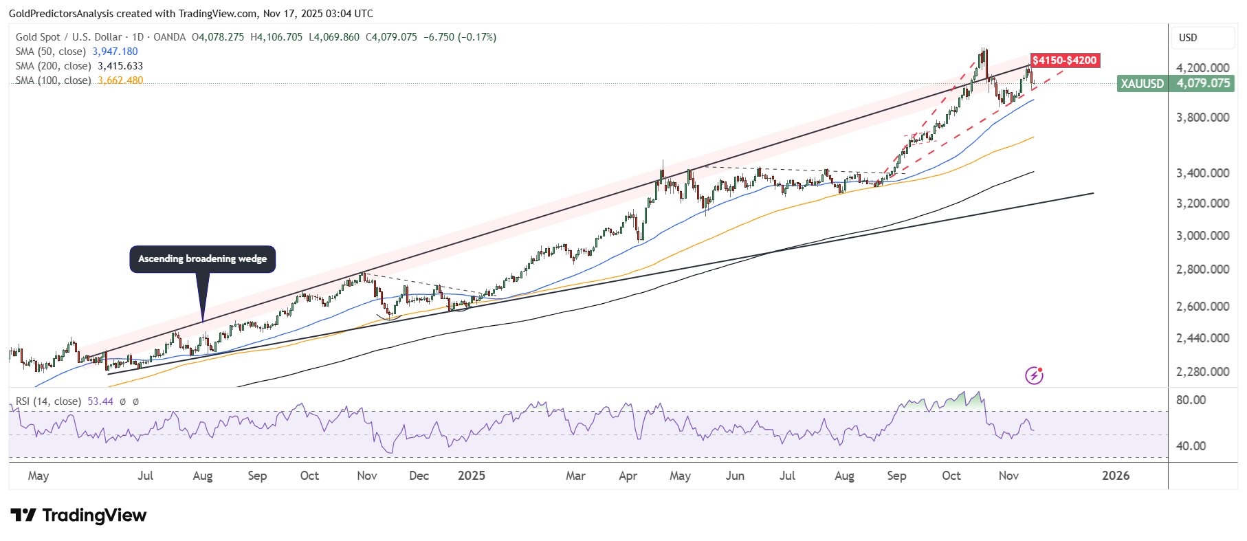 Biểu đồ khung ngày cho thấy giá vàng giao ngay chạm kháng cự gần 4,250 USD tại ranh giới trên của mô hình cái nêm tăng rồi rút lui về đường xu hướng đỏ hỗ trợ. Sự giảm này xuất phát từ vùng kháng cự mạnh, làm gia tăng sự không chắc chắn ngắn hạn. Cần một cú bứt phá rõ ràng trên 4,250 USD để mở ra đà tăng mới. Ngược lại, phá vỡ dưới 3,900 USD sẽ cảnh báo đợt giảm sâu hơn. RSI đang rời khỏi vùng quá mua, và nhịp điều chỉnh này được xem là giai đoạn hạ nhiệt lành mạnh, tạo nền tảng cho một bước tăng đáng kể tiếp theo.