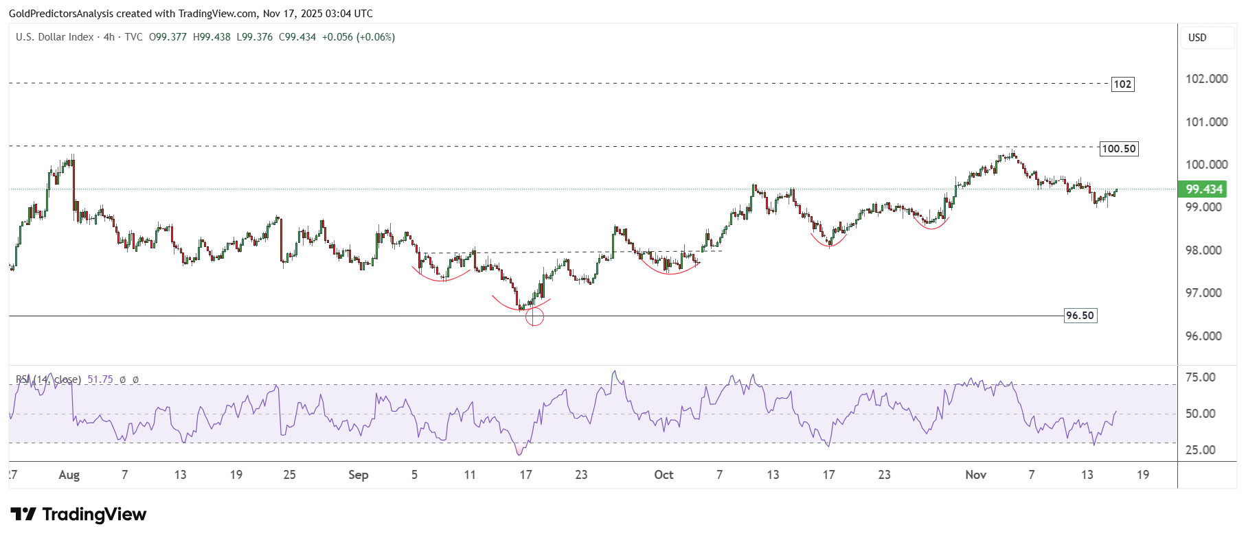 Biểu đồ 4 giờ cho thấy USD củng cố trong phạm vi 96.50 đến 100.50. Một cú bứt phá ra khỏi phạm vi này có thể đánh dấu kết thúc giai đoạn tích lũy và xác định hướng đi mới. RSI đang hồi phục từ vùng thấp, gợi ý khả năng tăng ngắn hạn. Tuy nhiên, mức 100.50 vẫn là vùng kháng cự then chốt, tiếp tục giới hạn khả năng mở rộng đà tăng.