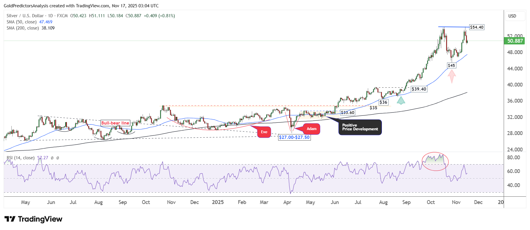 Biểu đồ khung ngày của bạc giao ngay cho thấy giá giảm từ mức đỉnh 54.40 USD. Tuy nhiên, cấu trúc xu hướng chung vẫn tích cực miễn là giá giữ trên vùng 45 USD. Nếu phá vỡ dưới 49.30 USD, bạc có thể giảm về vùng hỗ trợ 44–45 USD. Ngược lại, để xác nhận động lực tăng quay trở lại, giá cần bứt phá dứt khoát trên 54.40 USD.