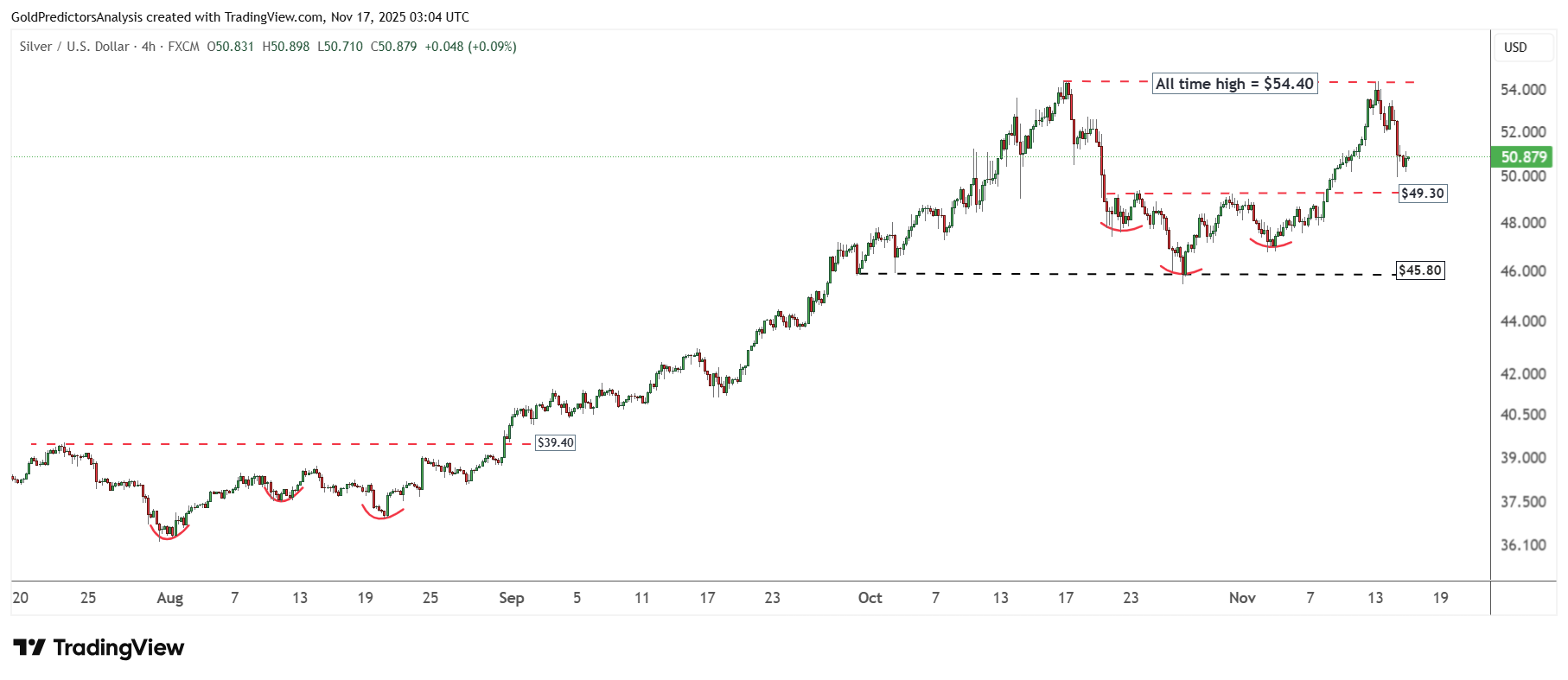 Biểu đồ 4 giờ cho thấy bạc duy trì cấu trúc giá tăng rõ rệt. Mặc dù giảm mạnh từ vùng 54.40 USD, mô hình tăng tổng thể vẫn không bị phá vỡ. Giá vẫn nằm trên hỗ trợ 49.30 USD, vốn là đường cổ của mô hình vai–đầu–vai ngược. Chừng nào bạc còn giữ vững trên mức này, giá có khả năng tiếp tục củng cố dưới 54.40 USD trước khi hình thành nhịp tăng kế tiếp.