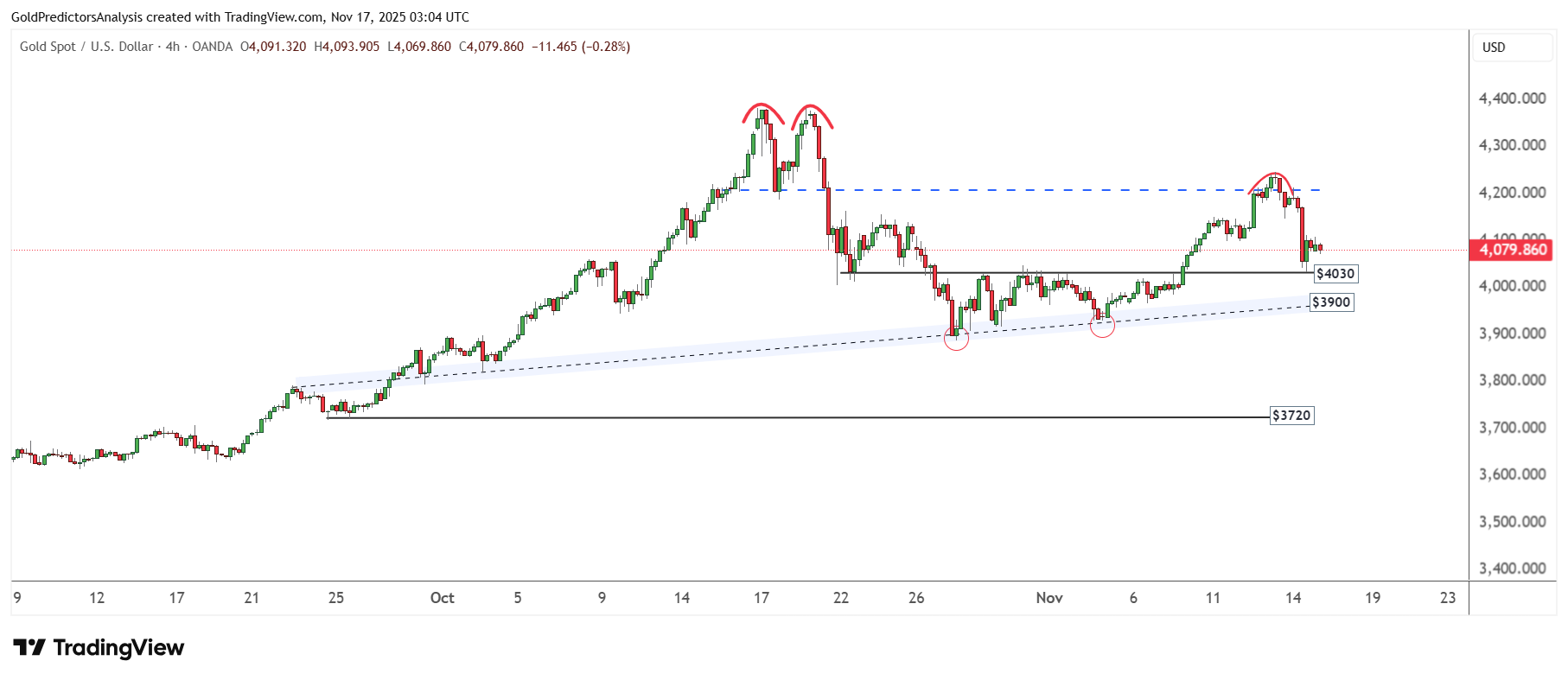 Biểu đồ 4 giờ cho thấy đà giảm gần đây bắt nguồn từ đường cổ của mô hình đỉnh đôi, kéo giá về đường xu hướng đen hỗ trợ. Nếu giá phá xuống dưới đường xu hướng chấm đen quanh 3,900 USD, đây sẽ là tín hiệu tiêu cực mạnh và có thể mở rộng đà giảm của vàng.